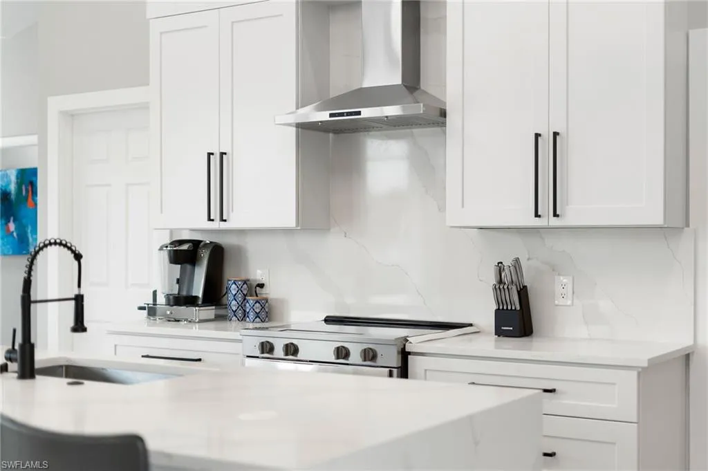 Inside, the single-level ranch layout flows effortlessly with a split-bedroom design and dramatic vaulted ceilings that frame the expansive open-concept living area. The chef’s kitchen is a showstopper—featuring white shaker cabinetry, a waterfall-edge island, high-end stainless appliances, and a generous walk-in pantry that can double as an owner’s closet. Perfect for entertaining, the light-filled great room and dining area connect seamlessly to the lanai through wide sliding glass doors, extending your living space outdoors.