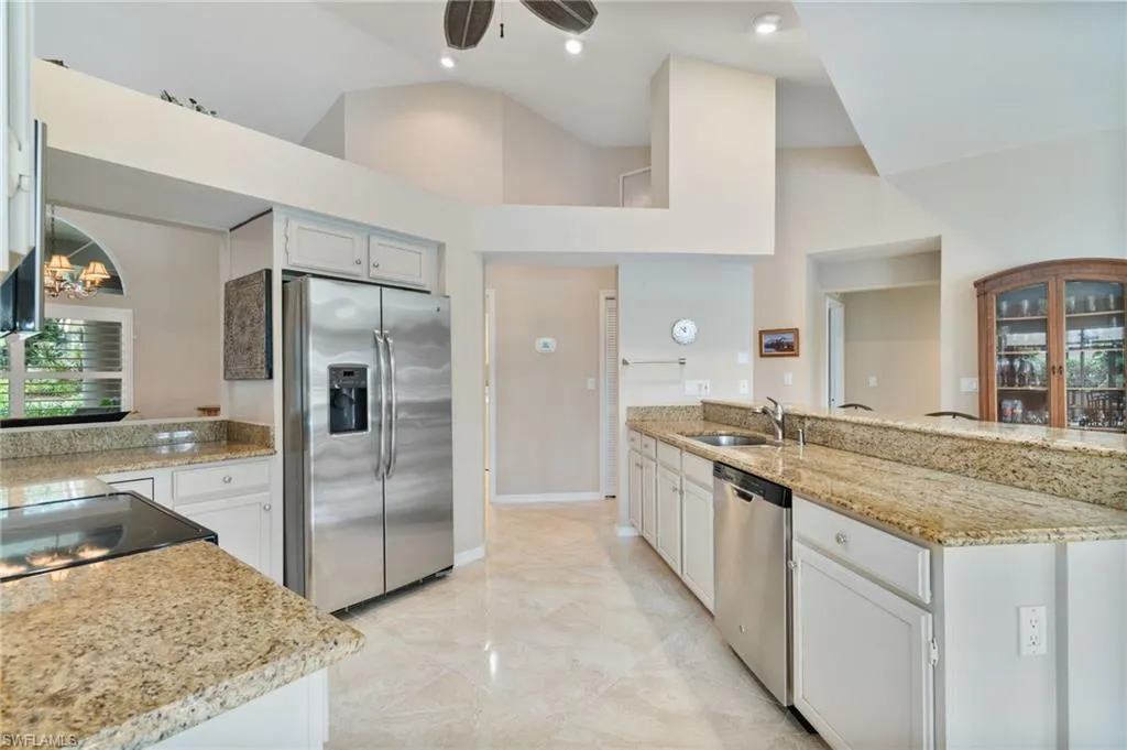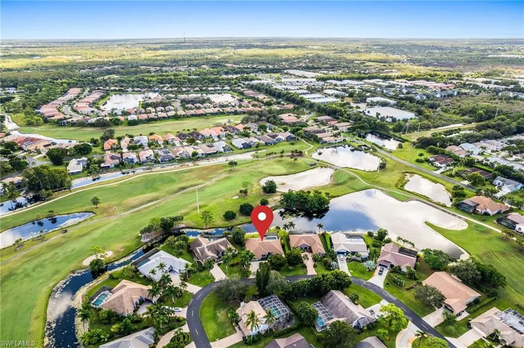 Excellent Floor plan with a Central Kitchen surrounded by a Large Family Room, Formal Living Room, Dining Room, Breakfast Nook, and easy access to a Large 689 sq ft. Covered Lanai for both Indoor and Outdoor Entertaining. This 3 bedroom, 2 bath, Pool Home is located on a Prime Lot offering Privacy and Southeast Views of the Lake and Golf course. The Vaulted Ceilings and Skylights, along with multiple sliders provides an abundance of natural lighting, and the split floor plan offers ideal privacy for guests. For increased safety and security, this house in located in an X-500 Flood Zone where Flood Insurance is Not Required. A New Tile Roof and large Picture Window Screen Enclosure were installed in 2023. Current Homeowners insurance is below $5,000 per year. The 600 sq ft garage has ample room for two passenger vehicles and a golf cart. Spanish Wells Country Club (membership is optional) offers a 27-hole golf course, tennis, fitness, bocce, and a variety of activities. This is an Ideal Location where community amenities, and ease of access to Barefoot Beach, Bonita Beach, RSW airport, Fine and Casual Dining, Coconut Point Mall, Mercato and Waterside Shops makes Living in SWFL a dream of a lifetime. Come see your little piece of paradise for yourself.