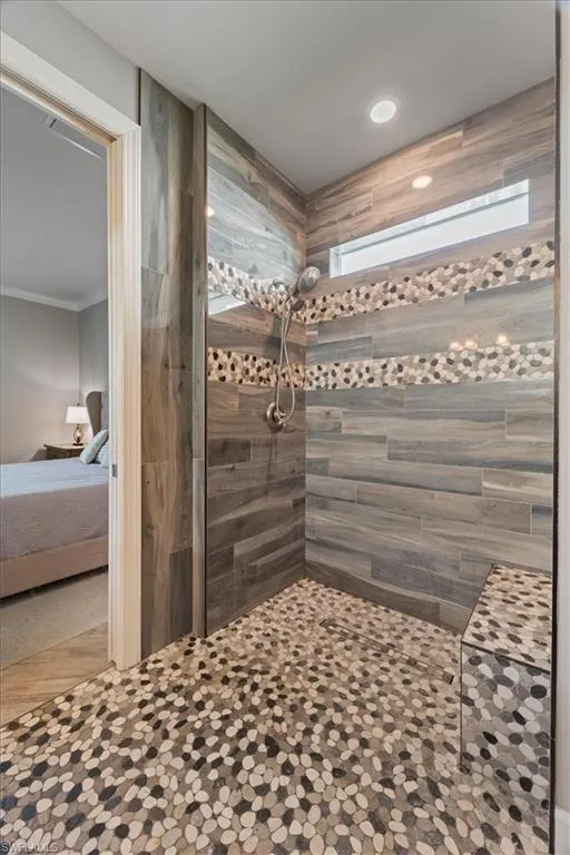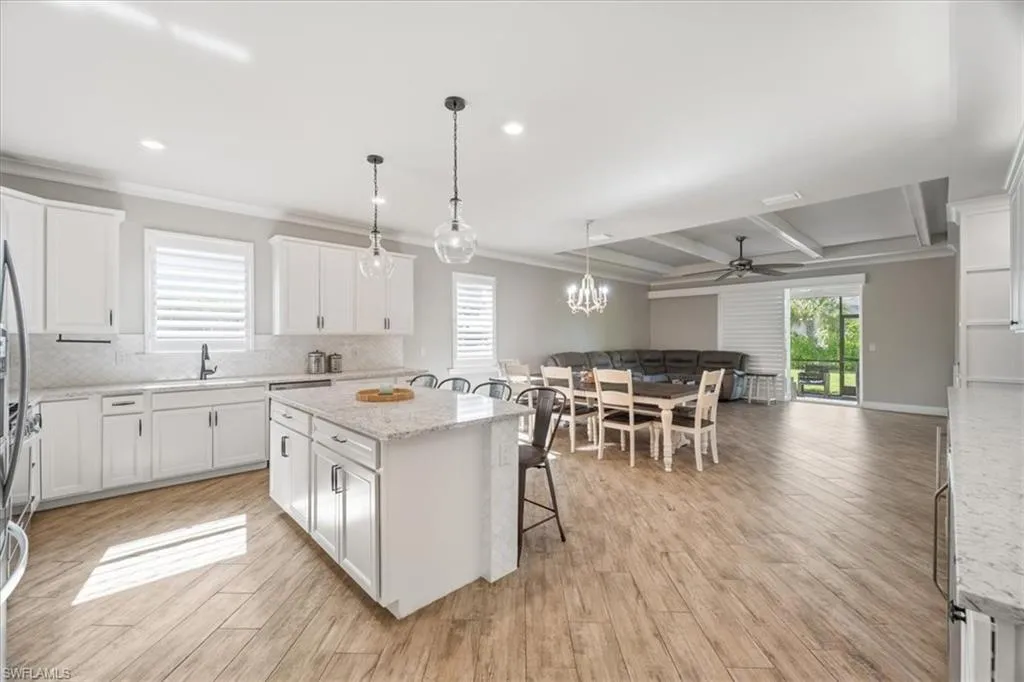 Welcome to this charming home in the highly sought-after Babcock Ranch community! This stunning 3-bedroom plus den, 2-bathroom residence offers 2,144 square feet of thoughtfully designed living space that perfectly balances elegance and comfort. Step inside to discover beautiful porcelain tile flowing throughout the home, complemented by plantation shutters that bathe every room in natural light. The heart of the home features a gourmet kitchen with porcelain backsplash above the counters and on the island, while the impressive wine bar with dual refrigerators and glass backsplash makes entertaining a breeze! The living room impresses with a custom built-in entertainment center featuring wired surround sound, beams and tray ceiling details. Crown molding adds sophisticated touches throughout the main living areas and primary bedroom, which boasts a walk-in closet and luxurious bathroom with walk-in shower and dual sinks. Practical features include a spacious 3-car garage and natural gas connections. The location truly sets this property apart—positioned on a quiet one-way street with an expansive green space directly in front that will never be developed, ensuring permanent privacy and tranquil views. Babcock Ranch offers exceptional amenities within walking distance, including top-rated Babcock Neighborhood School, community pools, and Founder’s Square. Jack Peeples Community Park provides additional recreational opportunities, while Publix Super Market ensures convenient shopping. This innovative neighborhood combines modern living with small-town charm, creating the perfect environment for making lasting memories.