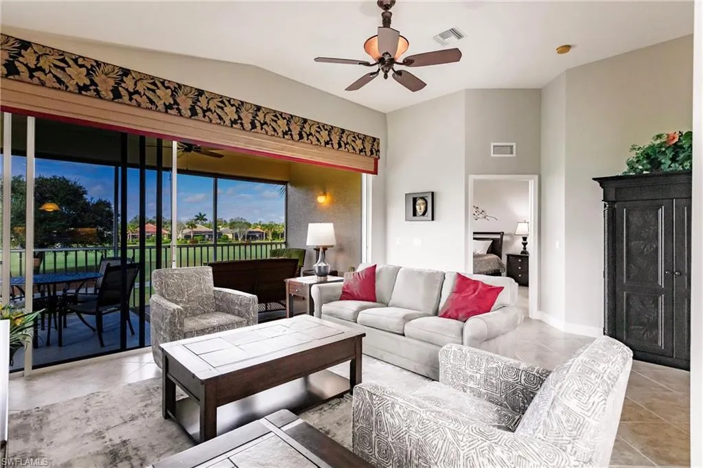 Stunning coach home featuring 1690 sq. ft. with a spectacular view of the Golf Course and Lake, is offered for sale and is move in ready in the gated Verandah community. This 2 Bedroom plus Den, 2 bath home is nicely appointed with neutral colors, plenty of natural sunlight and exquisite tastes. Included with this home are additional features such as diagonal tile throughout the main living area, plantation shutters in all windows, built in desk in den, backsplash in kitchen with accent lighting under cabinets and new appliances purchased in 2024. This home has been maintained meticulously and feels as if it has been hardly lived in. The home has an open family room and kitchen area with a great view of the Golf Course and Lake. All bedrooms are spacious with plenty of closet space. Master bathroom has dual sinks, separate tub and shower and bright lights.
