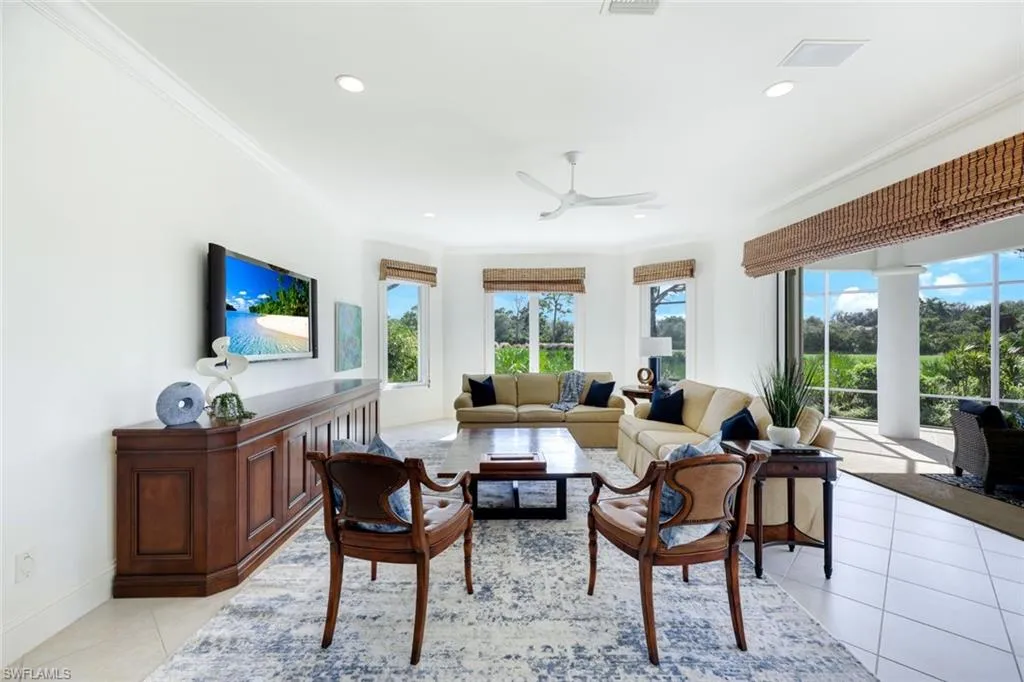 A perfect canvas for luxury living on coveted Gormican Lane, a quiet cul-de-sac street with just 26 private estates in the heart of Collier’s Reserve. Set on a premium out-of-flood-zone lot with sunny southern exposure and panoramic golf vistas, this custom-built residence combines timeless architecture, abundant natural light, and thoughtful design. While the owner’s suite, a guest suite, office, and everyday living spaces comprise over 3,400 square feet of main-floor living, two private guest bedrooms above provide comfort and space for visiting family and friends. Outdoors, an expansive lanai invites effortless entertaining and relaxation, with multiple seating, lounging, and dining areas surrounding a gas-heated 32-foot pool and spa—the perfect backdrop for sun-soaked afternoons and memorable gatherings. At the heart of the home, the remastered chef’s kitchen showcases Sub-Zero and Wolf appliances, including a 6-burner gas cooktop, a butler’s pantry/wet bar with beverage center, and refined finishes like soft-close custom wood cabinetry. The renovated owner’s suite and updated bathrooms elevate everyday luxury, while 15-foot high tray ceilings with crown molding, a fireplace and the spacious office with warm wood flooring add a touch of sophistication. Additional highlights include a two-car garage plus a separate golf cart bay, extensive built-in cabinetry for storage, a new flat-tile roof, and impact-rated hurricane protection throughout. Enjoy the unmatched lifestyle of Collier’s Reserve, developed by the Collier family as the first Audubon International Sanctuary club, offering world-class golf, tennis, pickleball, fitness & wellness, bocce, even kayaking, as well as a vibrant social calendar across casual and fine dining venues. Welcome home to Arthur Hills’ eco-friendly paradise.