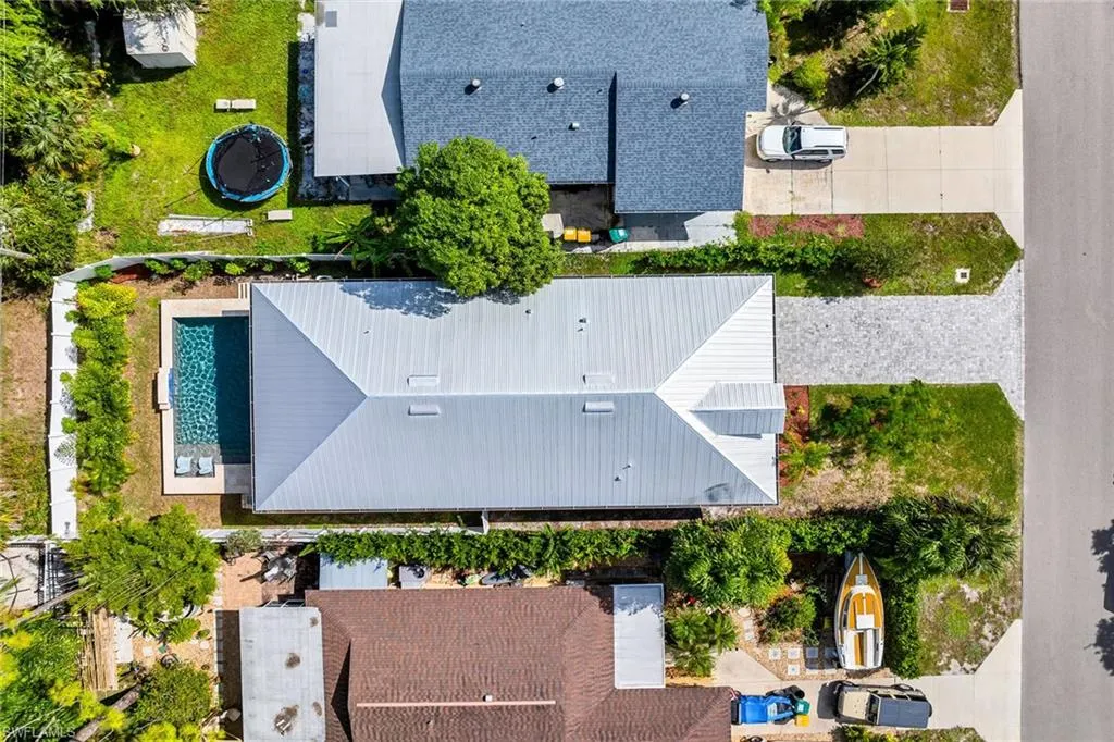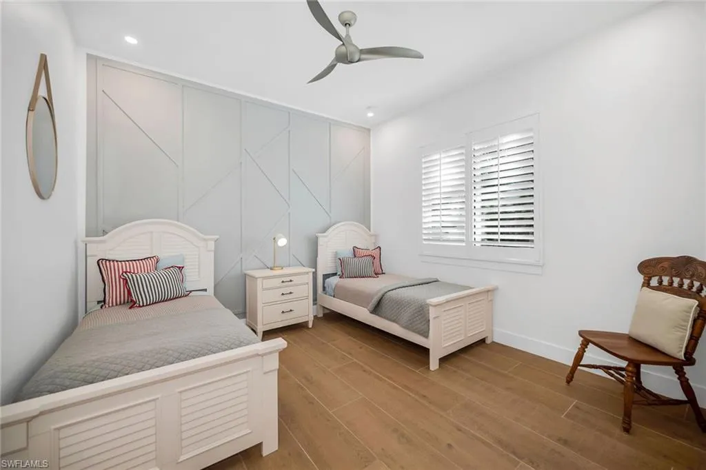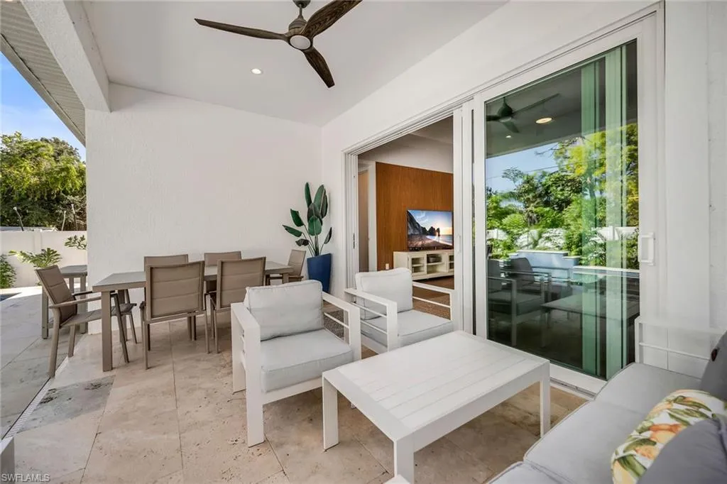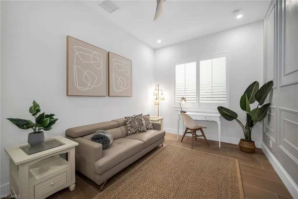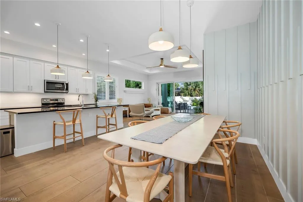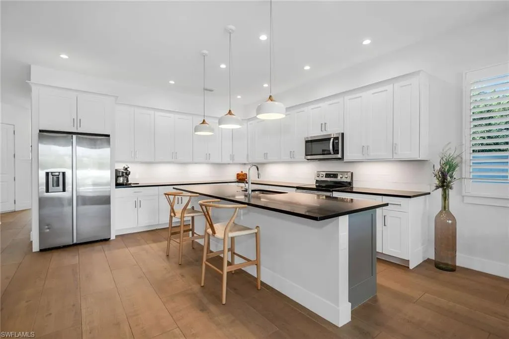 Perfectly positioned in one of Naples’ most desirable neighborhoods, this stunning southern-exposure residence combines modern design, comfort, and convenience with no HOA restrictions. Located just minutes from Vanderbilt Beach and Delnor-Wiggins Pass, you’ll enjoy the luxury of daily sunset strolls, nearby waterfront dining, boutique shopping, and vibrant local attractions. Whether seeking a full-time residence, seasonal getaway, or proven income-producing investment, this 2022-built home, enhanced by thoughtful 2025 updates, offers exceptional value in a prime location. Inside, every detail has been carefully curated to create a refined yet inviting coastal retreat. The open-concept layout features volume ceilings, recessed lighting, and wood-look plank tile flooring throughout. A spacious great room showcases a custom wood-slat feature wall with integrated acoustic panels that enhance both design and sound quality, while glass sliders open seamlessly to the lanai for effortless indoor-outdoor living. The chef’s kitchen impresses with white modern cabinetry, quartz countertops, a large island with pendant lighting and breakfast bar seating, and premium stainless steel appliances, including a new dishwasher, range, microwave, and refrigerator with icemaker. A custom wood-paneled accent wall defines the adjacent dining area, creating a warm and elegant entertaining space. The owner’s suite is a serene retreat featuring a tray ceiling with crown molding, lanai access, two walk-in closets—including a lockable one—and a spa-inspired bath with dual sinks, quartz countertops, and a frameless glass walk-in shower tiled floor to ceiling. Two beautifully appointed guest bedrooms each feature distinctive wall detailing and access to full designer baths with quartz vanities and transom privacy windows. A versatile den with French doors and a decorative paneled wall serves perfectly as a home office, quiet reading space, or optional fourth bedroom for guests. Step outside to your private oasis, where a heated saltwater pool with a sun shelf and waterfall feature invites year-round enjoyment. The covered lanai, complete with travertine flooring, recessed lighting, and a ceiling fan, provides the ideal setting for outdoor relaxation or entertaining. The fenced backyard ensures privacy, while the pool heater and autofill system are app-controlled for ease and efficiency. Additional highlights include solid wood doors, Grohe fixtures, impact-resistant MI windows and doors, a metal roof, plantation shutters, updated landscaping, and a two-car garage with epoxy flooring. Offering a rare blend of location, lifestyle, and investment potential, this move-in-ready Naples Park home captures the essence of relaxed coastal living just minutes from the Gulf.
