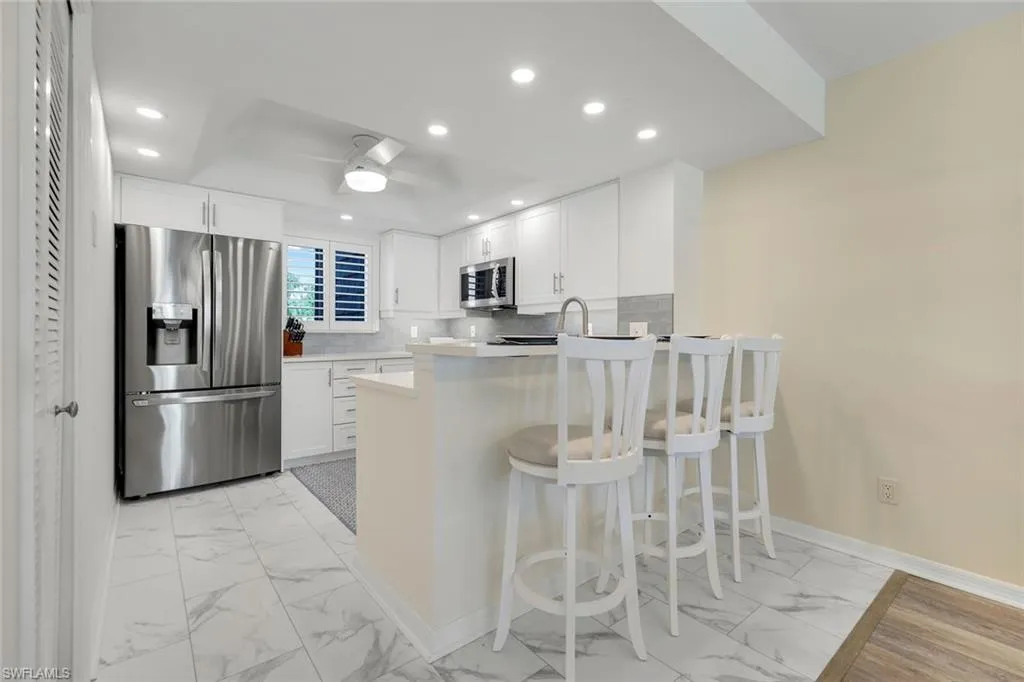 The absolute perfect Naples getaway home tucked away in a tropical oasis near the city and white sand beaches can be your very own! This completely renovated 2 bedroom, 2 bath condo showcases modern luxury and thoughtful design. Every corner of this unit is utilized for efficiency and offers storage galore! New Roof and updated community pool just steps away create an ease not unlike your own personal resort. This home offers a move-in-ready opportunity for the buyer seeking elegance and convenience. This home is a standout, sold turnkey furnished including high end TV’s, state of the art sound system, top quality finishes and furnishings that are fresh and coastal. Kitchen is bright, and white, with stainless appliances, and quartz counters. Designer lighting and fans throughout, fantastic local artist’s works on walls, all curated into a palette of crisp whites and blues, make this unit unique, and special indeed. Additionally, your private enclosed lanai offers a direct view of a shimmering lake and fountain that floods the home with morning light that must be seen to appreciate! Come see this slice of paradise today!