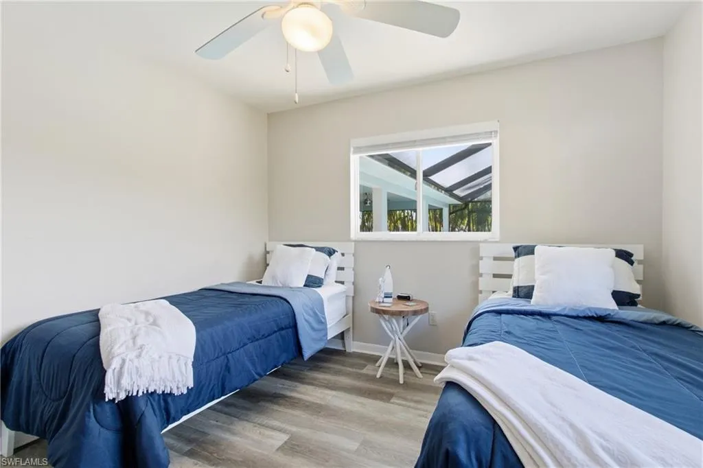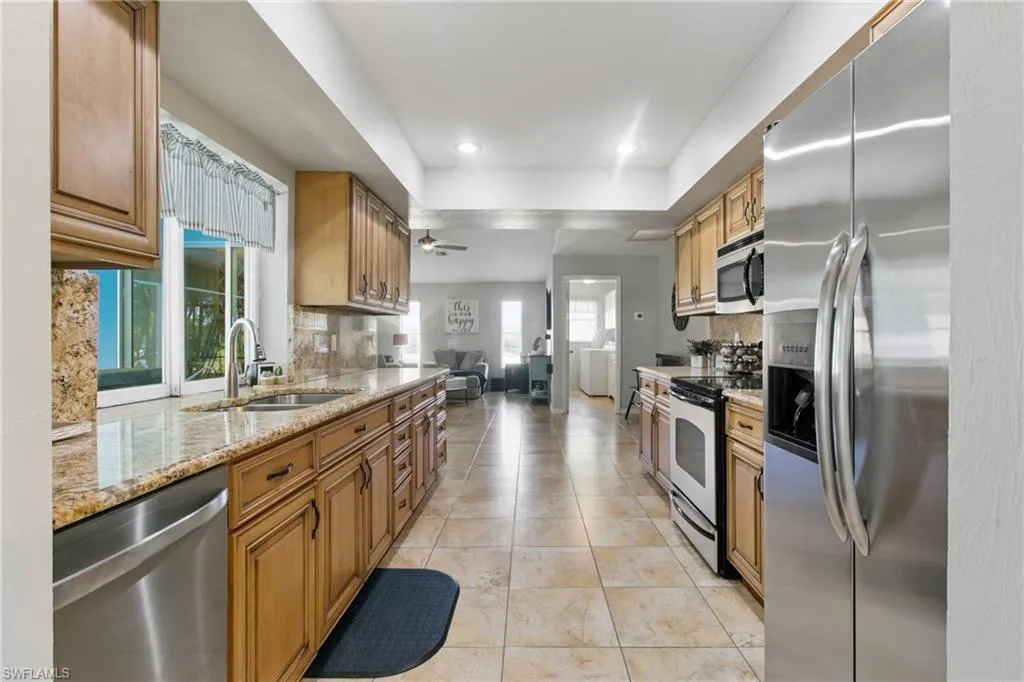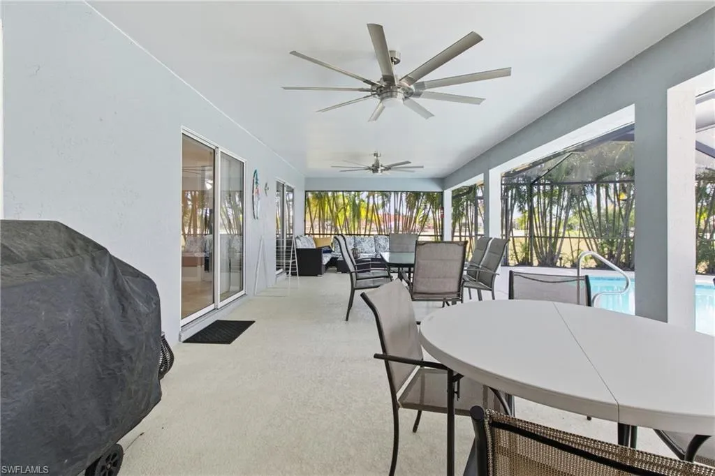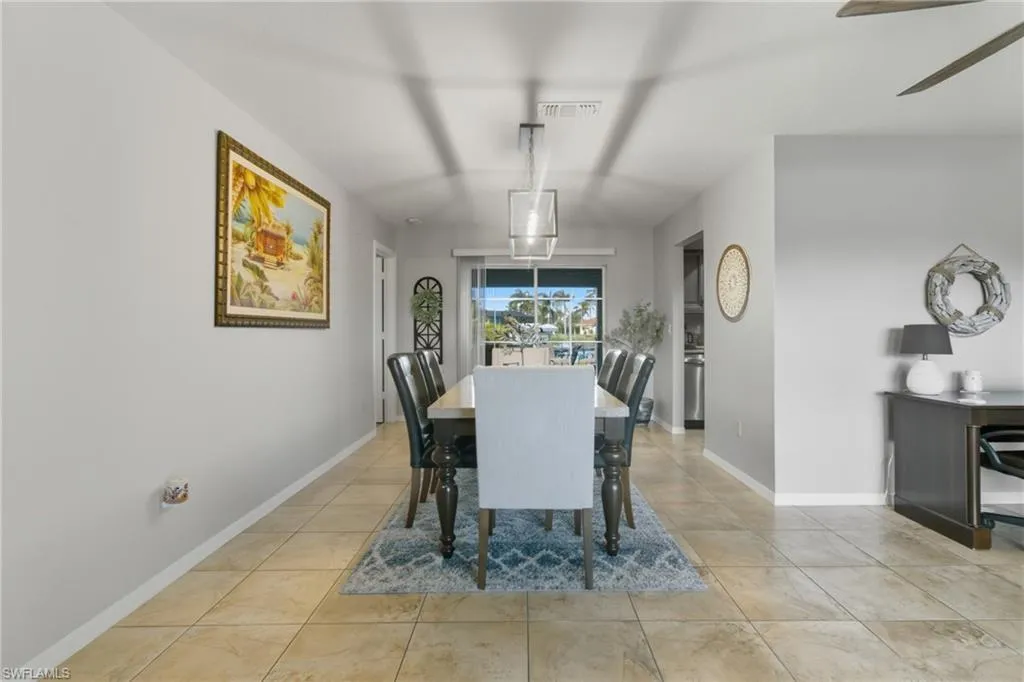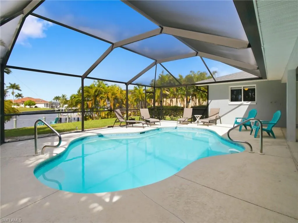 Discover your private, turn-key paradise in this gulf access 3-bedroom, 2-bathroom pool home, uniquely positioned on an expansive, elevated triple corner lot that has never flooded and overlooks the Mona canal. This meticulously maintained residence is fortified by a seawall and features a wooden dock with electricity, perfect for boaters. The home is designed for entertaining boasting 1875 sq ft, with granite countertops, a Butler’s Cabinet, and a convenient pass-thru window to the large lanai, while offering both a formal living room and a charming sitting room. Enjoy total peace of mind thanks to recent major updates that cost over $100,000, including a NEW POOL CAGE (2024), NEW ROOF (2022), a RE-SURFACED POOL (2022), plus fresh paint, new bedroom flooring, new furniture and modern fixtures all updated in 2022. Your heated pool and the spacious extended lanai provide the perfect venue for enjoying breathtaking SW Florida sunsets over the water every evening. Situated in one of the very sought after communities in SW Cape Coral, with award winning schools such as Oasis Charter Schools, Gulf and Ida S. Baker. The property has a very successful short term rental history, when not occupied by owners and all the tools to take on as an AIRBNB income producing investment. Priced to sell!
