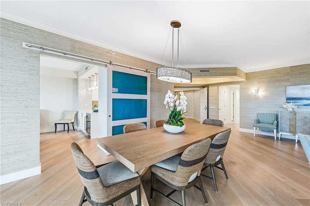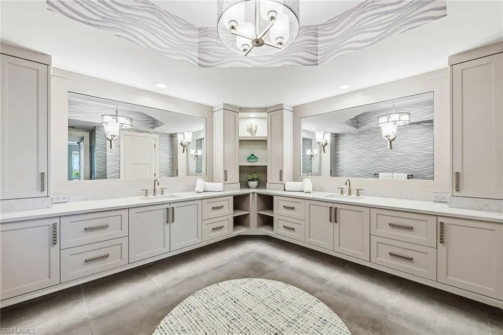 In the heart of Bay Colony, Naples’ most exclusive beachfront enclave, this elegant residence in Salerno captures the essence of refined coastal living. Every detail has been carefully considered in this furnished three-bedroom, three-bath residence, reflecting timeless sophistication and quiet luxury throughout its spacious design. Wide-plank white oak flooring unites the open, light-filled living spaces, while designer wall treatments and bespoke finishes lend warmth and character. The great room unfolds to a wrap-around lanai through an expansive wall of sliding glass doors, framing tranquil views and the golden hues of Naples’ celebrated sunsets. The kitchen has been meticulously reimagined with solid-wood cabinetry, quartz countertops, and a professional suite of Wolf and Sub-Zero appliances, offering both beauty and performance. The private primary suite serves as a tranquil sanctuary, featuring a spa-inspired bath and a custom-fitted walk-in closet. Two additional bedrooms, each with an elegantly updated bath, provide comfort and privacy for guests. In addition, a private elevator foyer and two parking spaces in the under-building garage provide convenience and privacy. Within Salerno, residents enjoy beautifully renovated common spaces, a resort-style pool and sun deck, and a well-appointed fitness center. Beyond the building, the Bay Colony experience unfolds with unrivaled privileges: a private beach club with elegant dining, beachfront pool, and full-service beach attendants, as well as a dedicated racquet center. Steps away, The Ritz-Carlton Naples extends five-star dining options, while Pelican Bay invites exploration with its scenic walking and biking paths, two beachfront restaurants, and more. This residence offers a rare opportunity to live within one of Naples’ most coveted coastal communities—where privacy, elegance, and a world-class lifestyle come seamlessly together.