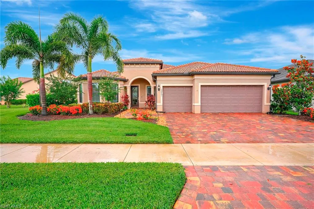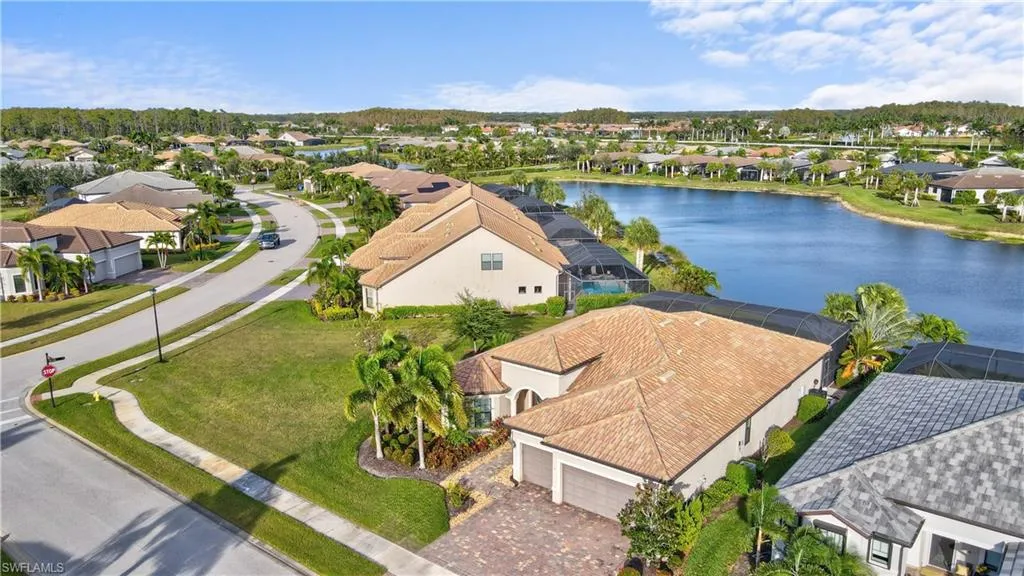 Ideal for multigenerational living or seasonal retreat, this elegant waterfront Pinnacle floor plan offers space, privacy, and resort-style comfort with three spacious bedrooms (including two en-suites), three full baths, a versatile den, and an extended three-car garage. The open-concept design features floor-to-ceiling pocket sliders that open to a private lanai with a custom heated pool and oversized spa—perfect for relaxing or entertaining across generations. The gourmet kitchen boasts granite countertops, 42-inch off white cabinetry, a designer tile backsplash, premium stainless-steel appliances with wall ovens, a walk-in pantry, and a beverage bar with fridge. The luxurious primary suite includes a sitting area, spa-style bath with dual vanities and walk-in shower, and a custom-built closet. Additional upgrades include impact-resistant windows and sliders, electric roll-down Kevlar hurricane screens, a picture-frame lanai screen, coffered ceilings, crown molding, plantation shutters, and sleek plank tile flooring. Located in a vibrant, amenity-rich community with tennis, pickleball, bocce, a state-of-the-art gym, and a resort-style pool and spa, the HOA also covers cable, internet, lawn care, and exterior pest control. Conveniently located near I-75, RSW Airport, upscale shopping, fine dining, and Gulf beaches, this partially furnished home offers the perfect blend of luxury, flexibility, and Florida lifestyle—ready to welcome you home