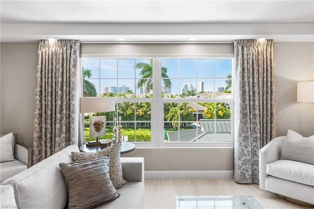 Your Naples retreat awaits! Welcome to this stunning turnkey 1 bedroom, 1 bath condo in the heart of highly-desirable Park Shore. Completely renovated down to the studs by Stock Development and professionally furnished by Clive Daniel, this residence offers a luxurious, move-in-ready lifestyle west of US-41. You are just moments away from the private Park Shore beach, Venetian Village, Waterside Shops,and a short drive to Vanderbilt Beach, Mercato and downtown Naples’ trendy boutique shopping and dining scene. Designed with chic sophistication by award-winning designer, Wilfredo Emanuel, every detail exudes quality and timeless style. Step inside to a bright living area with impact-resistant windows overlooking the Harborside Terrace grounds and Naples beachfront skyline. The gourmet kitchen features stainless steel appliances, soft-close cabinetry, a wine fridge, and quartz countertops and opens to the elegant living area. The beautifully appointed bedroom has custom bedding and window treatments, silk wallpaper and features a generously sized walk-in closet and a beautifully appointed bathroom with custom vanity, glam counter, and shower/tub combination. Additional features include Sonos sound system, tray ceilings, dimmable, recessed lighting, neutral tile flooring throughout, in residence laundry, newly installed digital, remote thermostat and hot water heater, and a deeded carport with extra storage. The elevator is conveniently located right outside your door for effortless access. Harborside Terrace offers a community pool, community room, and a friendly atmosphere for seasonal and full-time residents alike. Experience the perfect blend of location, design, and access to Naples’ finest beaches, dining, shopping, and destinations.