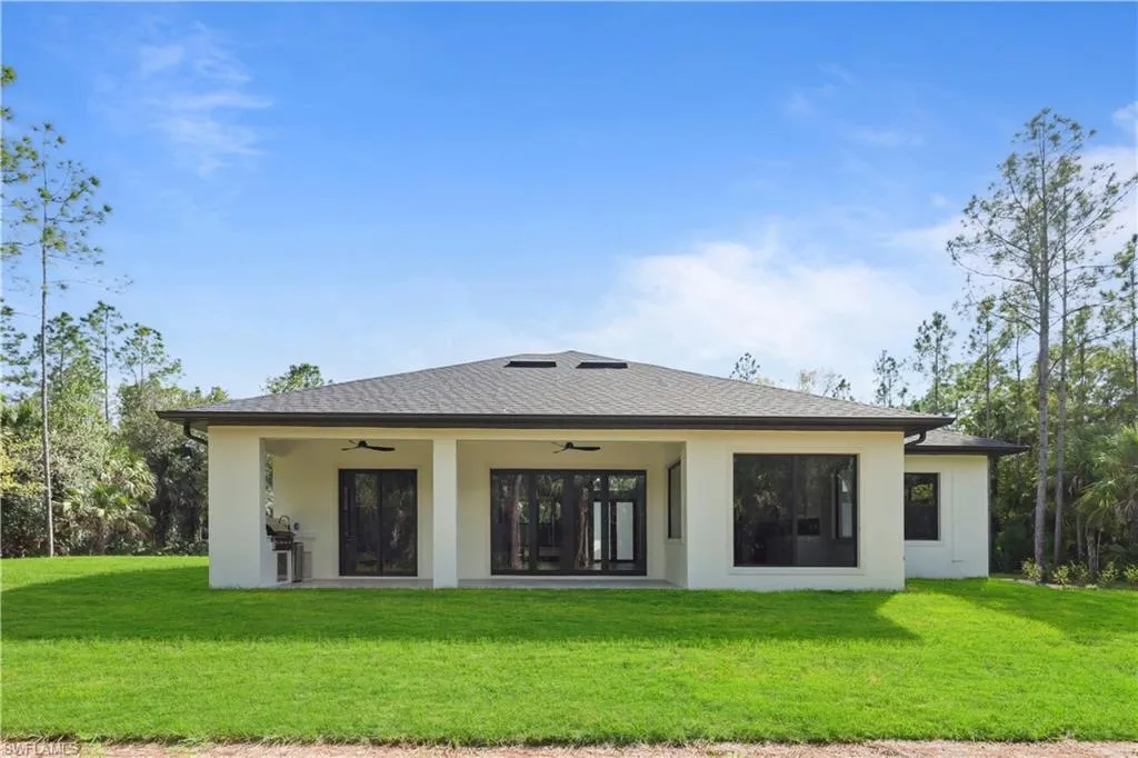 Step out to the lanai and enjoy, a built-in grill, cooler, and stucco cabinetry. Exterior is surrounded by lush landscaping with floral touches and natural rock details that reflect the home’s thoughtful design. Exterior sconces complete the look, glowing softly at dusk.