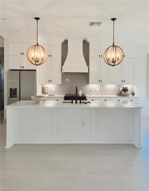 The kitchen is both elegant and functional, featuring a custom 10-foot island, cabinetry with deep drawers for storage, and a French-style range hood that anchors the space. A walk-in pantry with built-in shelving, classic light fixtures, and a beautiful backsplash complete this showpiece kitchen.