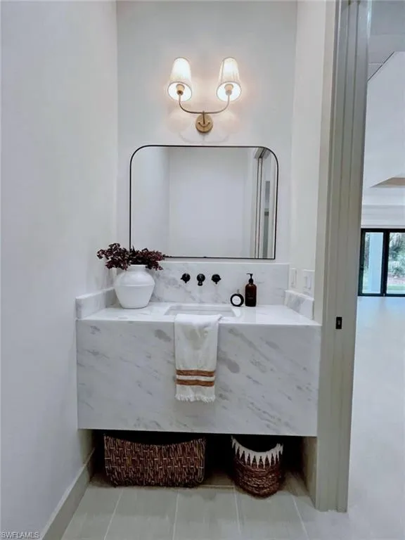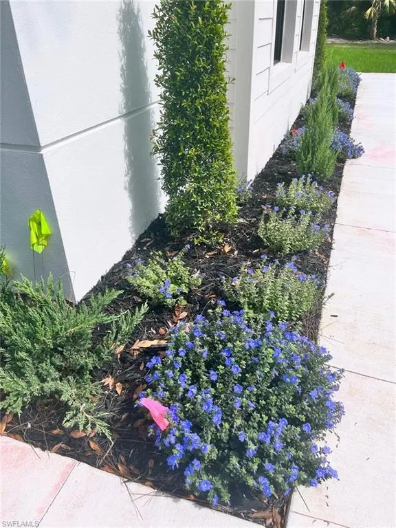 Step out to the lanai and enjoy, a built-in grill, cooler, and stucco cabinetry. Exterior is surrounded by lush landscaping with floral touches and natural rock details that reflect the home’s thoughtful design. Exterior sconces complete the look, glowing softly at dusk.