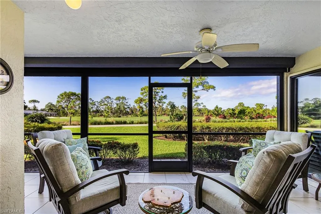 Discover this charming 1st-floor condo in Carriedale Gardens, perfectly situated within the vibrant Fiddlesticks Country Club community. Spanning 1,547 SQFT, this light-filled residence features 3 bedrooms, 2 bathrooms, and a convenient 1-car carport with space for a vehicle and a golf cart, plus a dedicated storage locker. Enjoy southwest rear exposure that bathes the home in natural light and offers breathtaking sunset views over a panoramic golf course, serene lake, expansive blue skies, and lush trees with manicured landscaping. The inviting great room floor plan boasts tile flooring throughout, a split bedroom layout for privacy, and plantation shutters on all windows. The updated kitchen is a chef’s delight with white shaker cabinets, granite countertops, a quartz-topped island seating three bar stools, stainless steel appliances, and a built-in wine cooler with bar area. Tastefully furnished and move-in ready, the home includes sliders from the master bedroom and office to the expansive lanai. The master suite impresses with updated cabinets, granite countertops, dual vanities, and a luxurious shower featuring a rainfall head, bench, and secondary showerhead. The lanai spans the full length of the condo, providing ample space for relaxation, complete with an additional storage room. Guest bedroom #1, currently configured as an office, includes a slider to the lanai and a convenient Murphy bed. Guest bedroom #2 is elegantly appointed with a king bedroom set. The guest bathroom is beautifully updated with granite countertops, shaker cabinets, dual vanities, and a combo shower/tub enclosed by a glass door. Ideally located just steps from the Carriedale community pool and a short stroll to the Fiddlesticks Clubhouse and Cabana, this villa offers unrivaled access to world-class amenities. Fiddlesticks Country Club, an award-winning private golf community, boasts two championship golf courses, eight Har-Tru clay tennis courts, and a resort-style zero-entry pool with a stunning cabana—delivering a lifestyle of leisure and prestige. Don’t miss this rare opportunity to own a slice of paradise in one of Southwest Florida’s most coveted communities. Schedule your private showing today and experience the Fiddlesticks lifestyle firsthand!