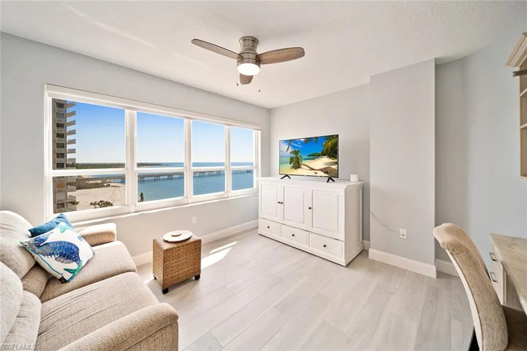 Panoramic paradise! Lover’s Key living at the rarely available Island Beach Club. Gorgeous 5th floor FURNISHED unit with expansive views of Estero BAY & the GULF of Mexico. Experience the warm breeze and salt air with your choice of sunrise or sunset over the water without leaving the comfort of your balcony. Take an elevator ride down to the crystalline sands and estuaries at your doorstep. The interior features include a spacious layout, new flooring, new kitchen, quartz countertops, updated bathrooms, hurricane impact windows & sliders and motorized blinds. Recently updated AC and water heater. Amenities include a pool, spa, clubhouse, fitness room, tennis courts, outdoor grilles and picnic space, available as repairs are made. Assigned secure parking, guest parking available. Plenty of closet space and storage with a temperature controlled storage unit. Deeded Boat Dock is available for purchase separately.The location is surrounded by the beauty of nature, with modern conveniences, airport and medical care close at hand. Proximity to world class shopping & dining including Flippers on the Bay along with private beach steps away. Call today & start living the dream!