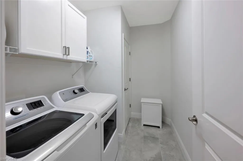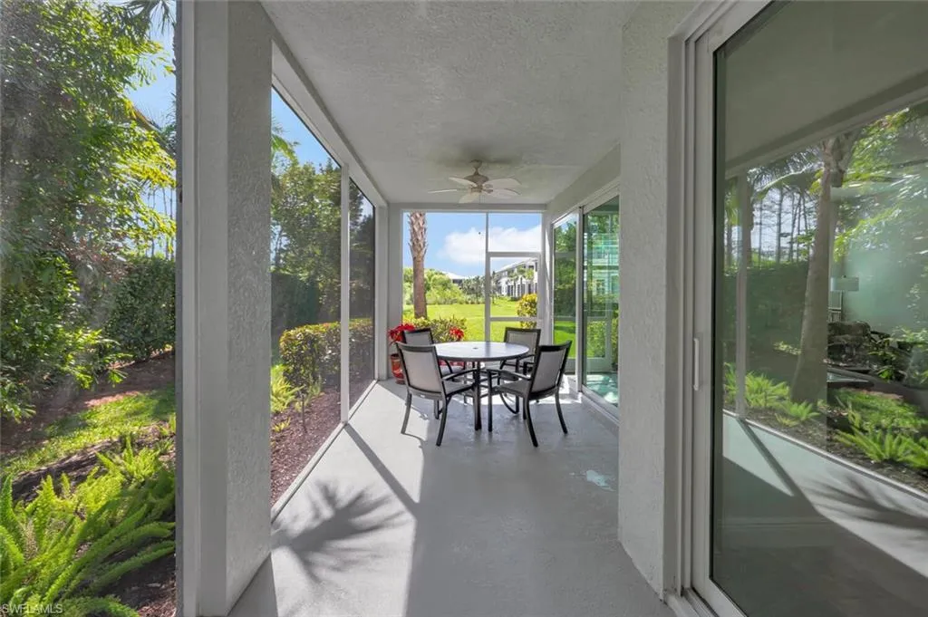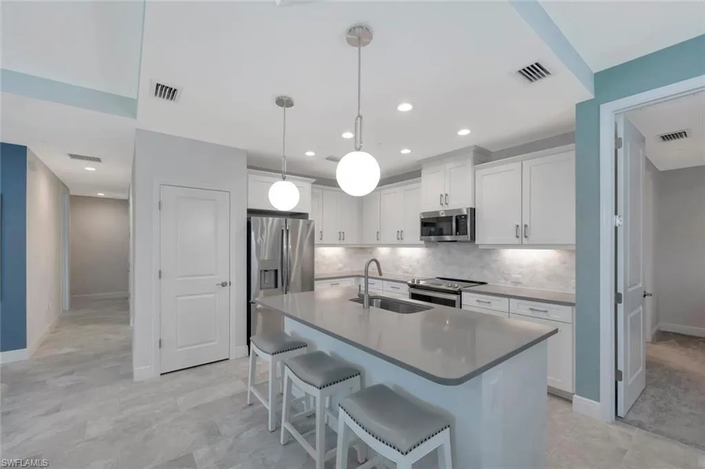 BUILT IN 2020, this beautifully upgraded 2 bedroom, 2 bath END UNIT home offers a peaceful and lush GREENSCAPE view. From the moment you step inside, you will appreciate the attention to detail, with high-end Pasha porcelain tile flooring, designer kitchen backsplash, and a chef’s dream kitchen featuring soft-close drawers, sleek satin nickel hardware, and upgraded GE stainless steel appliances. The center island with a single-bowl stainless sink and Moen faucet adds both style and functionality, while under-cabinet lighting and quartz countertops enhance the space. A large pantry and hall closet ensure ample storage. The dining area is elegantly appointed with a designer chandelier, and noiseless ceiling fans throughout. The spacious primary suite boasts a custom tray ceiling with crown molding, an 8×10 walk-in closet. The guest bedroom is equally inviting, featuring a gorgeous Murphy bed with decorative side cabinets for additional storage. Step outside to a spacious lanai where the unique offset position of the unit allows for an unobstructed and private landscape view. Impact sliding doors seamlessly blend indoor and outdoor living, while plantation shutters in the bedrooms and accordion blinds on the sliders offer both privacy and flexibility. A private entrance with an EXPANSIVE driveway on a cul-de-sac location complete this exceptional property. A must-see for those looking for style, comfort, and quality in a peaceful setting located minutes from downtown Naples!