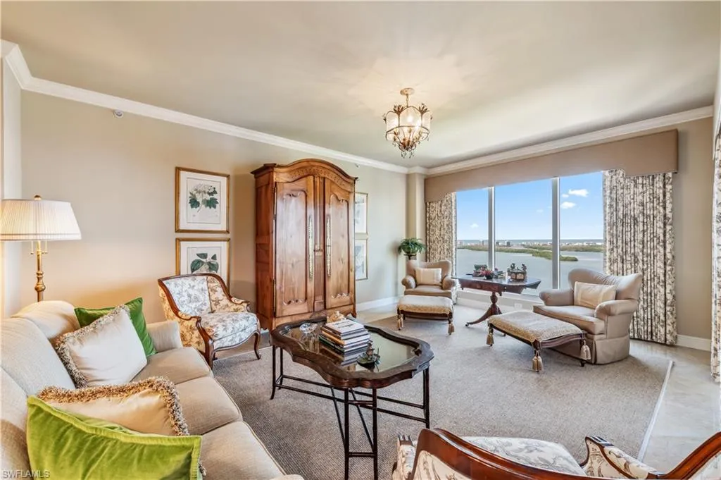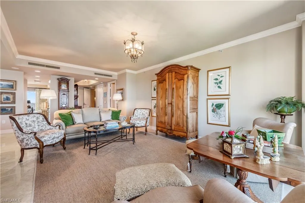 A special opportunity to own a rarely available higher floor “02” floor plan unit in Esperia. Located on the 19th floors of Esperia with beautiful panoramic views of the Estero Bay and the Gulf of Mexico. This residence features classic style, high-end interior furnishes and design by Colins & Dupont Design Group. Many premium upgrades. 3 Bedrooms/3 Full Baths and Open Den with 2,730 sq. ft. feet under air. This residence features open and panoramic views from all the main living areas. Enjoy stunning Gulf sunsets everyday from your own private screened lanai. An open balcony to the East is the perfect spot to enjoy your morning coffee and croissants! A SPECIAL BONUS–YOUR OWN PRIVATE 2-CAR GARAGE LOCATE DON THE SECOND FLOOR, adjacent to the elevator, is INCLUDED in the Sale! Offered PARTIALLY FURNISHED (inventory to be provided). Esperia now features a recently completed total renovation of its first and second lobby areas by professional interior designers. The Esperia-Seaglass Clubhouse, Card Room and Billiards have just being re-opened with the full renovation done, please see photos. this offers truly exceptional quality of living in an unbeatable location.