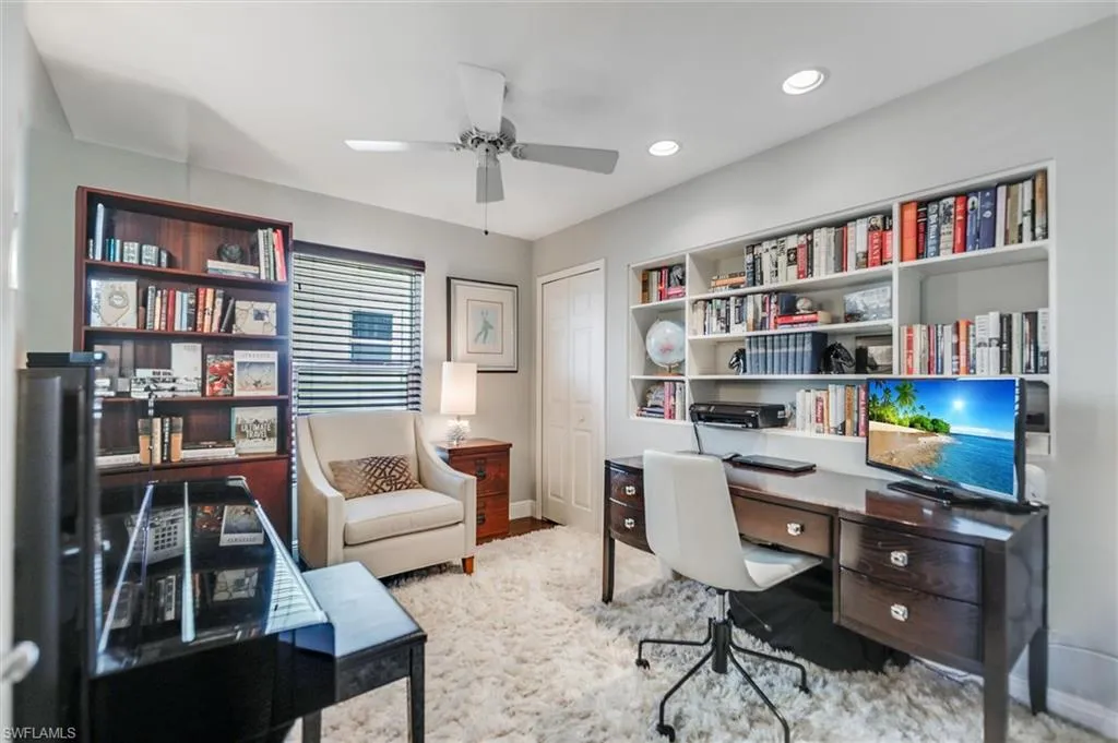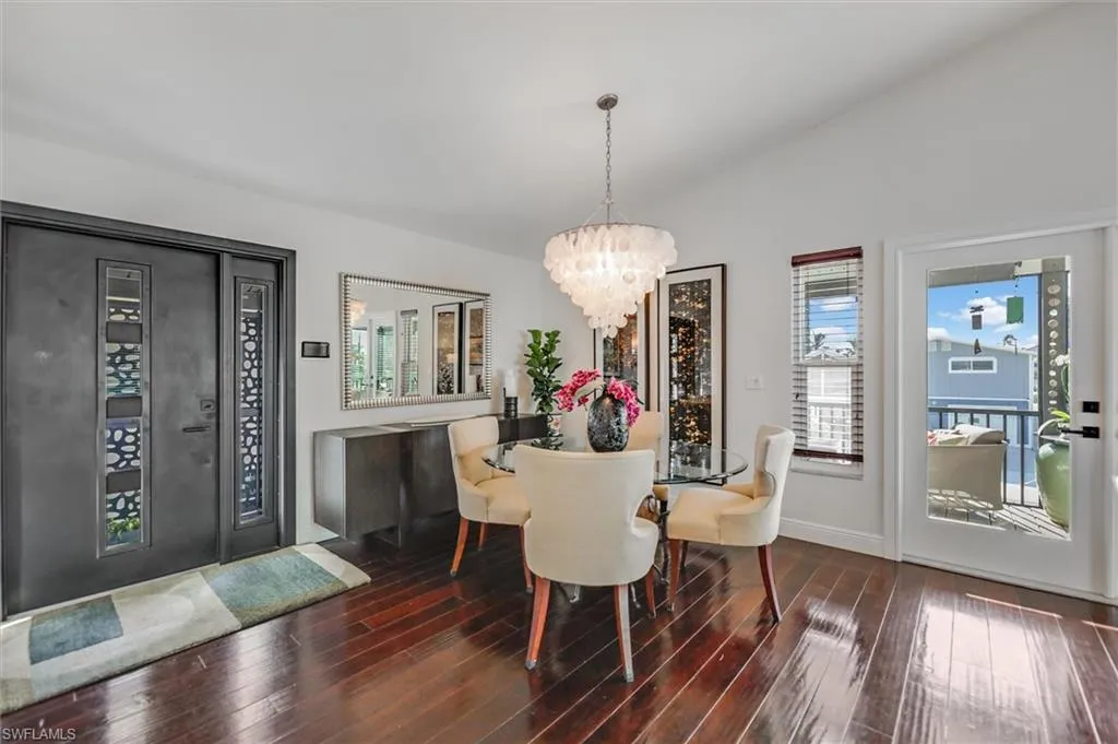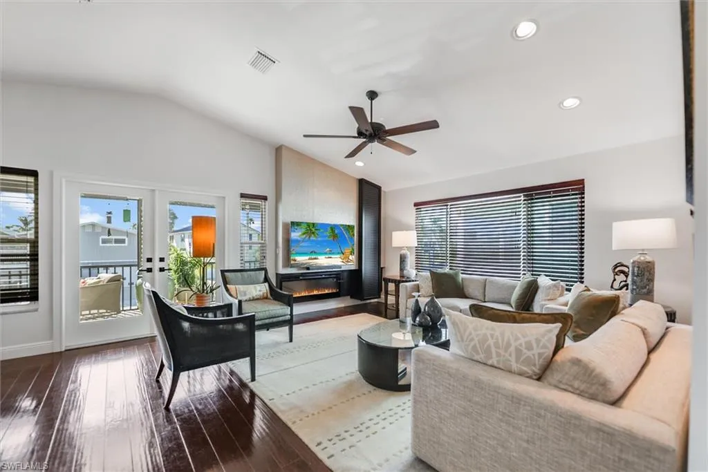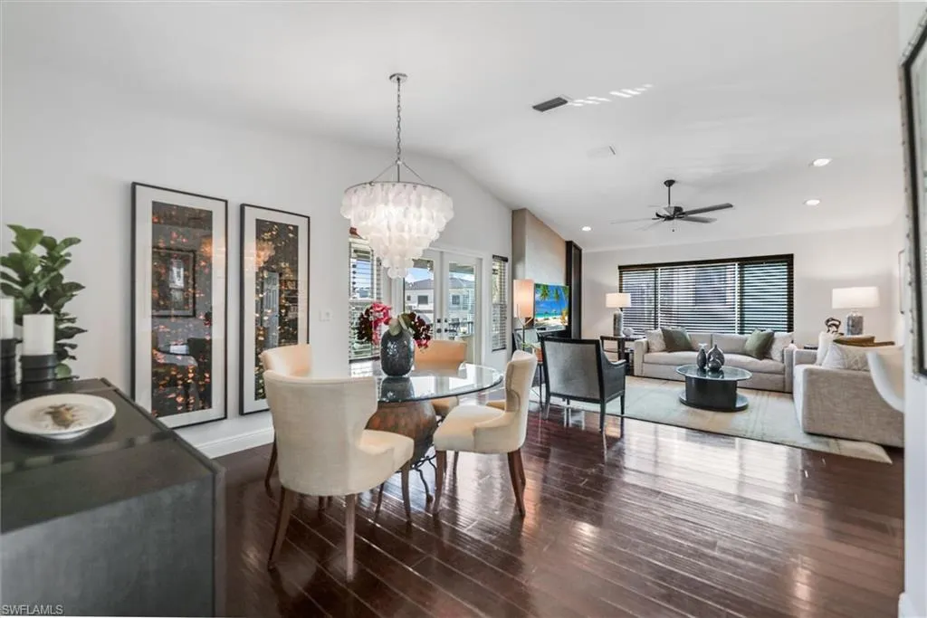 Interior design and furnishings by owner, an ASID certified designer, includes walnut hardwood flooring throughout the home as well as walnut stained wood venetian blinds on 175 mph hurricane proof windows. Cathedral ceiling in main living area, custom decorative lighting and large media built-in wall with electric fireplace/heater surrounded by absolute black granite. Modern furnishings and fabrics by Kravet, Baker, Bernhardt and Hickory White.