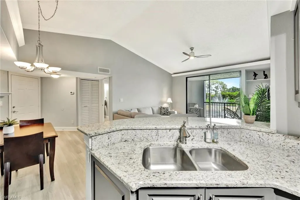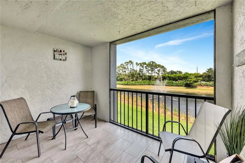 Beautifully renovated and move-in ready, this 3-bedroom, 2-bath second-floor condo in Musa at Daniels offers serene lake and fountain views from its extended screened lanai—a rare feature that provides extra space for relaxing or entertaining. Inside, the light-filled open layout features vaulted ceilings, luxury vinyl and tile flooring in the main living areas, and plush carpeting in the bedrooms for added comfort.