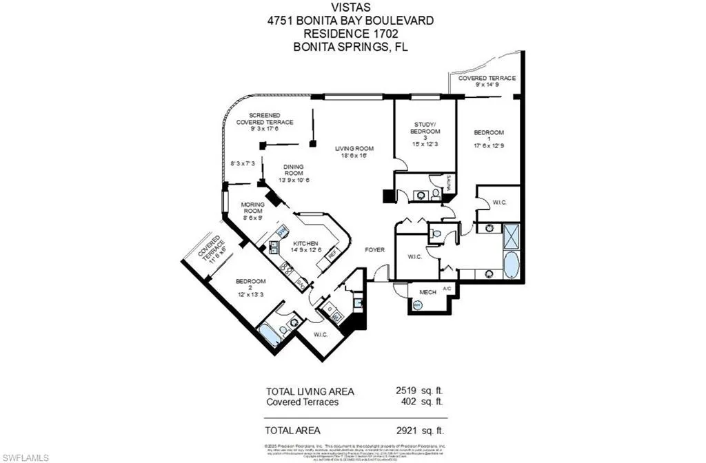 This fabulous spacious split floorplan, 17th floor residence, with upgrades, embodies the casual yet sophisticated lifestyle of SW Florida. Floor-to-ceiling sliding glass doors opening onto three west and south facing terraces provide spectacular views of Gulf of Mexico, Golf Courses and Estero Bay from every room! Watch the dolphins play in Estero Bay and enjoy fabulous sunsets over the Gulf of Mexico. Finishes include 18 inch tiles on the diagonal, crown molding, wood cabinetry with slide out shelving, granite counters. Aspiring chefs will love the spacious, centrally located kitchen with adjacent sun filled breakfast room. There are storm shutters on the screened terrace, and an infrared sauna in bathroom three. This residence comes with two parking spaces and separate storage area. Vistas offers 2 guest suites, updated communal areas with social and card rooms and fitness center. Vistas also has a spacious pool and spa with bar and grill area. Bonita Bay has 5 golf courses, 15 court tennis center 18,000 s.f. fitness center 8,000 s.f. Lifestyle spa & salon, full-service marina, Gulf front beach park, 6 restaurants, 15 pickle ball courts, crochet, bocce ball, canoeing, life enrichment center, 3 parks & more.