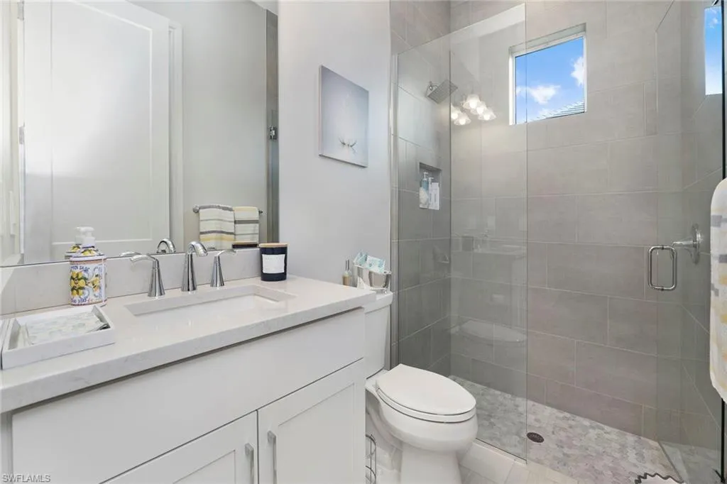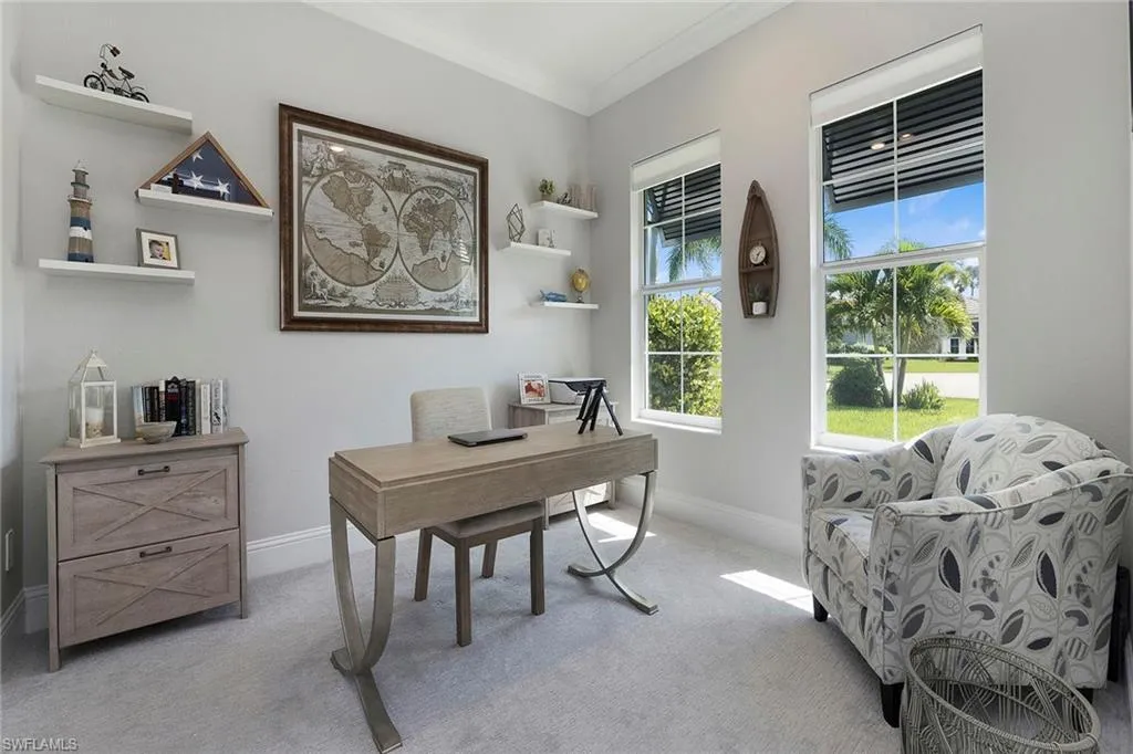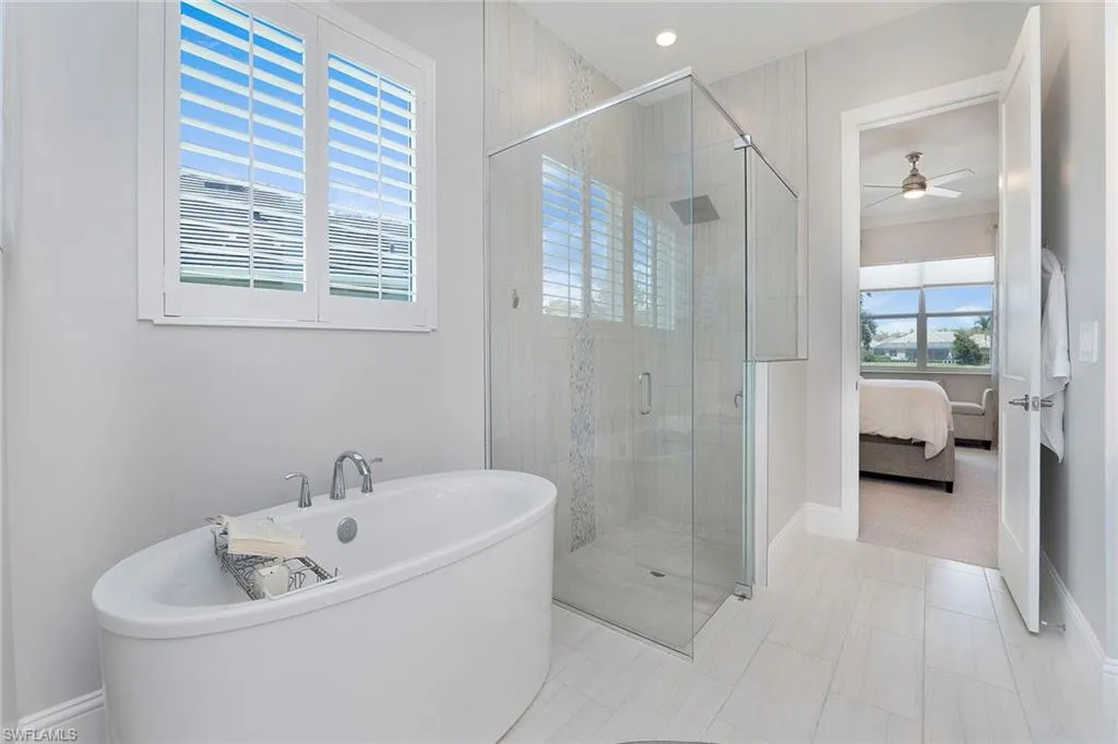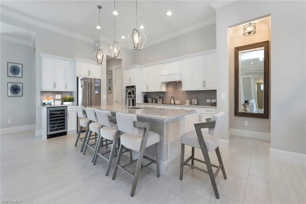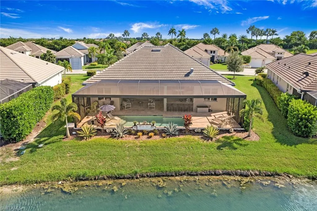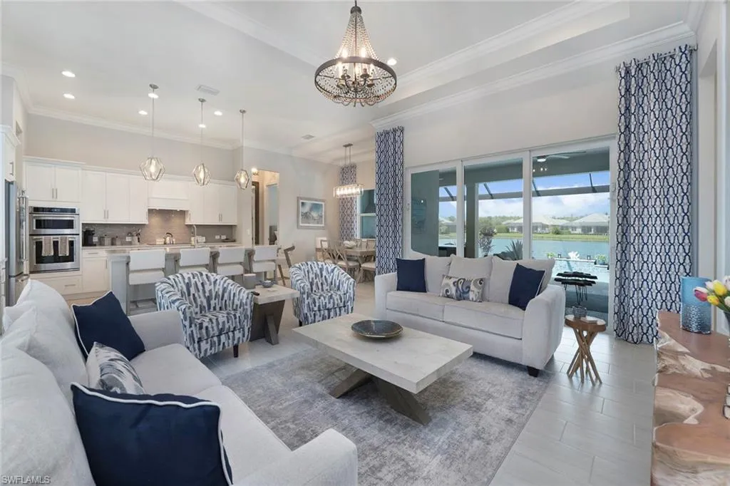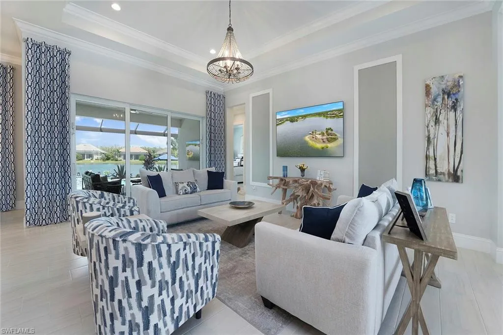 Experience a balance of style, comfort and craftsmanship in this beautifully designed home by Stock Development, ideally on a premium pie-shaped waterfront lot in the resort-inspired community of Naples Reserve. From the moment you arrive, you’ll appreciate the inviting curb appeal, spacious layout, and the seamless connection between indoor and outdoor living. Inside, the home offers four bedrooms and three full baths, each designed with refined finishes and thoughtful details. The gourmet kitchen is the heart of the home, complete with sleek cabinetry, high-end appliances, an oversized island and custom lighting that creates a warm, elegant ambiance for everyday living and entertaining. Flowing effortlessly from the kitchen is the great room, where expansive windows and impact glass doors frame the tranquil water views beyond. The primary suite is a serene retreat featuring a spa-like bath with a floating soaking tub, dual vanities and a generously sized walk-in closet. Each additional bedroom provides comfort and privacy, while the tile-to-ceiling detail in every bath adds an elevated designer touch. Throughout the home, you’ll find crown molding, premium finishes and an attention to detail that sets this residence apart. Go outside to discover an outdoor oasis, an expansive travertine pool deck overlooking the water, featuring a heated saltwater pool, custom outdoor kitchen and multiple areas to relax, dine or entertain under the Florida sun. Whether hosting gatherings with friends or enjoying a quiet evening by the water, this space is designed for unforgettable moments. Additional highlights include a three-car garage with insulated doors, added attic insulation and custom storage racks, ensuring efficiency and functionality. The home’s impact glass windows and doors provide peace of mind and energy efficiency year-round. In Naples Reserve, residents enjoy access to a vibrant lifestyle surrounded by stunning lakes, lush landscapes and exceptional amenities including a resort-style pool, fitness center, tennis, pickleball, boating and the popular Island Club.