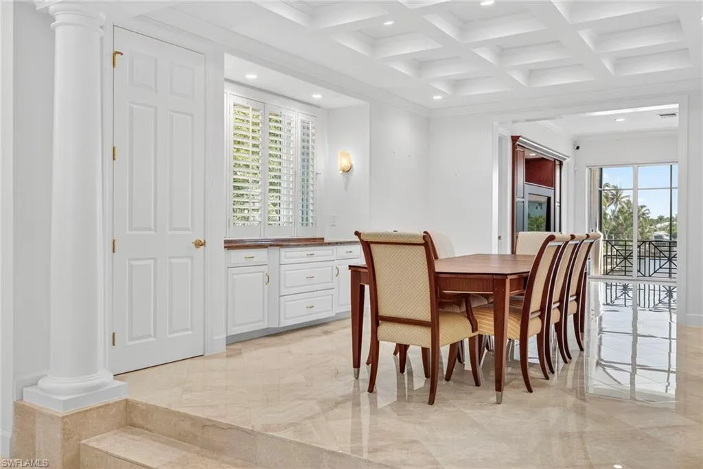 Inside, the attention to detail is evident throughout. The main living level features stunning marble floors, a welcoming living room with a propane fireplace, and a formal dining room enhanced by a coffered ceiling and custom-built ins. The expansive family room opens through impact sliders to a screened lanai overlooking the pool and canal, blending indoor and outdoor living seamlessly. The gourmet kitchen is the heart of the home, showcasing a center island, breakfast bar, stand-alone refrigerator and freezer, gas range, and a butler’s pantry with a wall oven, ideal for entertaining or family gatherings. A guest bedroom with a private bath on this level ensures comfort and convenience for visitors.