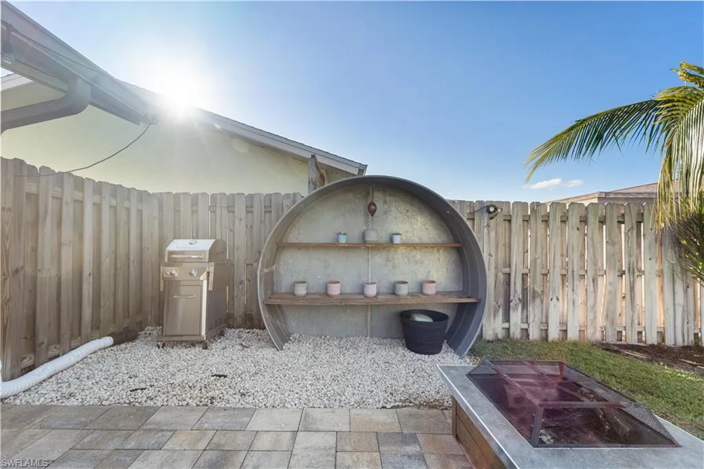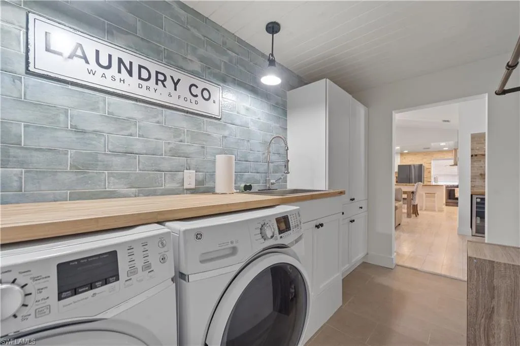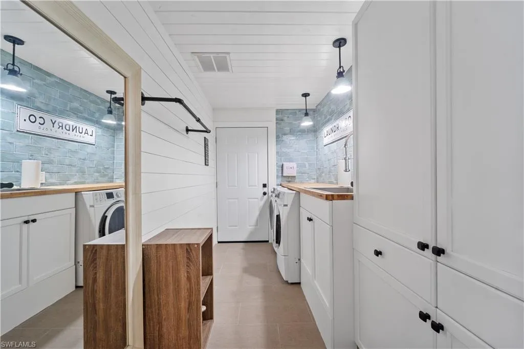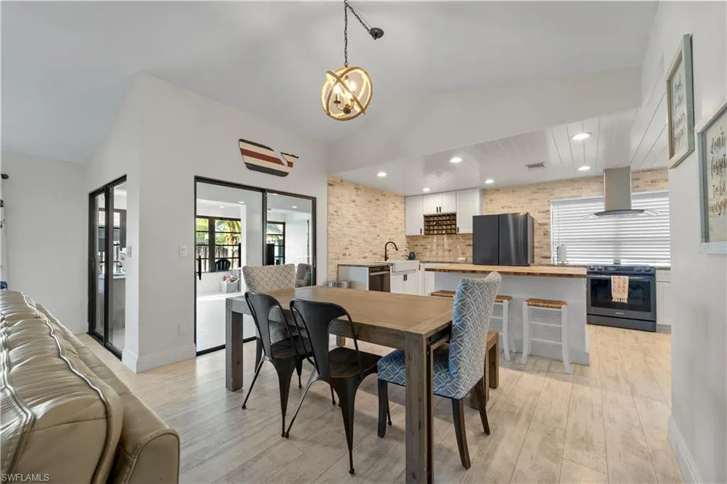 Welcome to 9802 Wildginger Drive, a fully remodeled coastal-inspired 2 bedroom, 2 bathroom home in one of the most convenient and desirable pockets of South Fort Myers. This beautifully upgraded residence offers a bright open-concept layout with vaulted ceilings, custom recessed lighting, and luxury finishes throughout. The heart of the home is the designer kitchen, featuring a wood herringbone butcher-block island, granite countertops, exposed brick backsplash, deep farmhouse sink, Samsung stainless steel appliances, soft-close cabinetry, open shelving, a built-in wine rack, and a dedicated bar area with dual-zone wine cooler. A spacious 288 sq ft sunroom offers additional living and dining space, while the thoughtfully planned 76 sq ft indoor laundry room provides custom cabinetry, counter space, and storage. The primary suite includes a walk-in closet and a stunning spa-style bath with quartz vanity, shiplap detail, niche-tiled walk-in shower, matte black fixtures, and frameless glass enclosure. The guest bath is equally impressive with subway tile, designer flooring, and upgraded finishes. Additional highlights include a 2019 roof, tankless water heater, updated fixtures and lighting throughout, wood-look flooring, and a 2-car garage. Step outside to a fully fenced backyard with an expansive paver patio perfect for grilling, outdoor dining, and relaxing in the Florida sunshine. Located minutes from Fort Myers Beach, Sanibel Island, McGregor Blvd, Gulf Coast Medical Center, and premier shopping and dining at Bell Tower and Coconut Point, this home offers effortless access to parks, boating, golf, and year-round coastal recreation with a very LOW HOA (187/quarterly). HOA Amenities include: LAKEFRONT Community Pool and Clubhouse! Blending modern craftsmanship and coastal charm in a highly convenient location, this move-in-ready home delivers a rare combination of style, function, and lifestyle in the heart of Fort Myers.