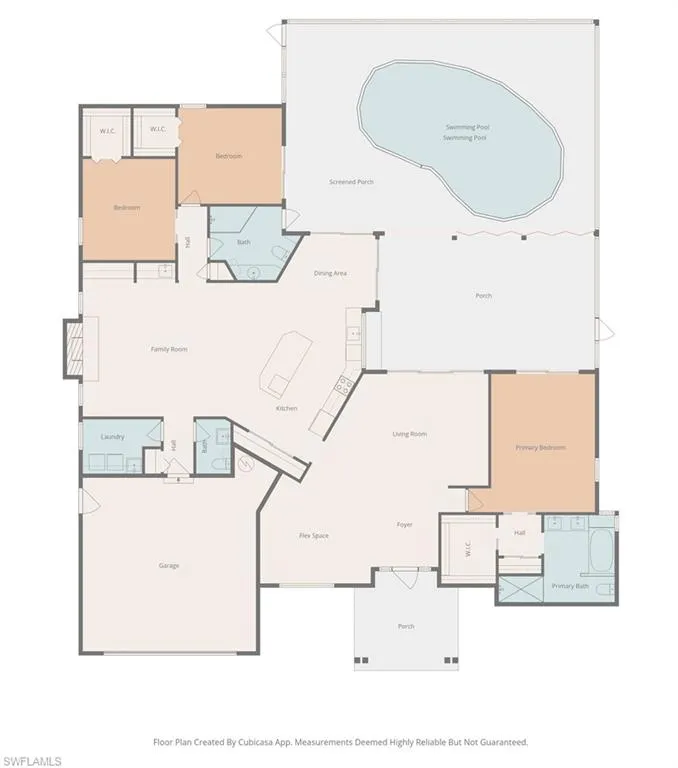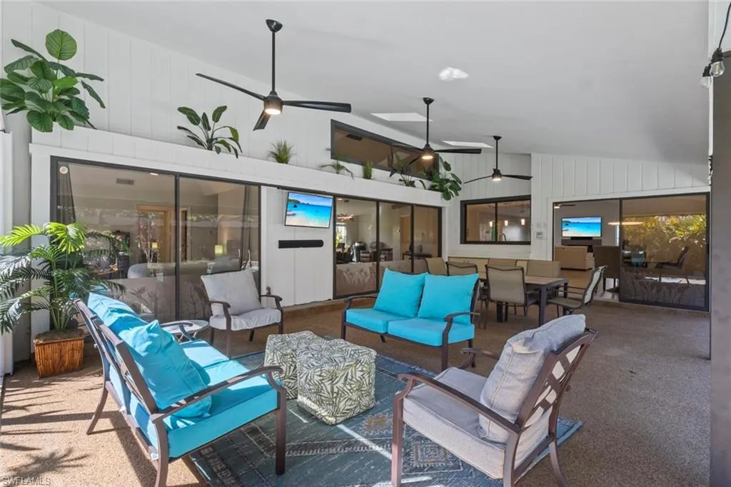 Beautifully updated pool home in the coveted community of Kings Lake. This 3-bedroom, 2.5-bath residence offers nearly 2,500 sq ft of living space with multiple living areas, soaring vaulted ceilings, and a bright, open layout. The upgraded kitchen features new countertops (2025) and a convenient pass-through window to the pool area. Recent improvements include upgraded electric, two new HVAC units, new washer and dryer, new refrigerator, and fresh paint (all 2023). The home also features solar panels, a cozy fireplace, hurricane shutters, and abundant natural light from multiple skylights. The landscaping has been refreshed with new plantings and numerous fruit trees throughout the yard. Enjoy the large screened lanai with pool and a private backyard backing to the walking trail—no rear neighbors! Kings Lake offers scenic walking paths and a prime Naples location just minutes to downtown and the beach. Ideal for full-time or seasonal living.