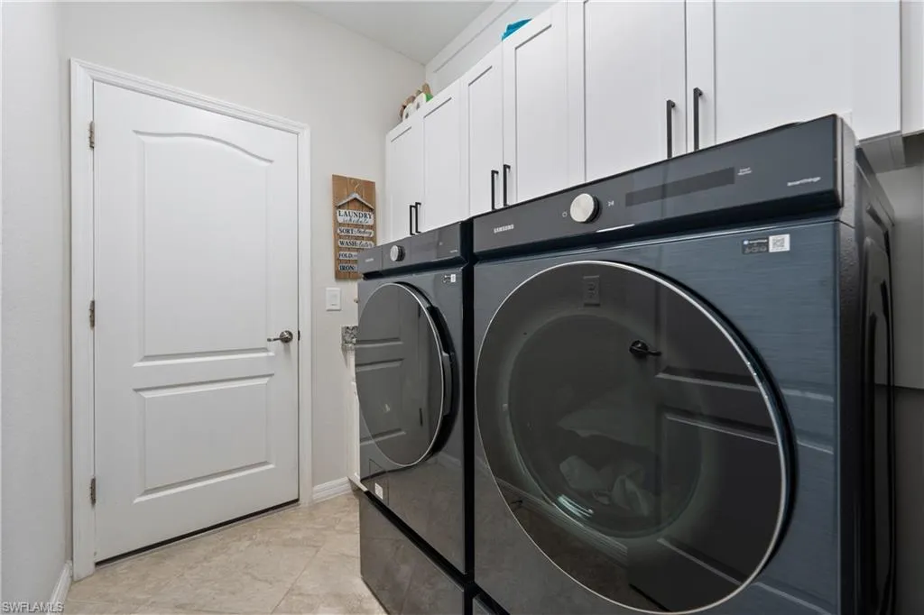 Additional interior highlights include diagonal tile throughout, beautiful light fixtures in every room, plantation shutters in the dining room, and custom window treatments in the living room and primary suite. Elegant wood ceiling designs add warmth and character. The laundry room features an upgraded washer and dryer set with white cabinetry for extra storage. A mini-split A/C unit in the garage (2025) provides year-round comfort, gutters have been installed around the entire home (2025) for added protection, and an epoxy garage floor (2025) adds a sleek, durable finish.
