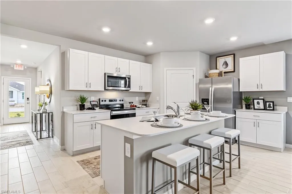 WELCOME TO YOUR NEW DR HORTON HOME!! This is our appealing one-story, open concept, 2077 sqft LAKESIDE Floorplan featuring 5 bedrooms, 3 bathrooms, 2-car garage, a covered under-trusses lanai and all concrete block construction. This home is on a beautiful lot located in Cape Coral. This home boasts Designer cabinets and quartz countertops in both the kitchen and baths. Experience the timeless beauty and durability of RevWood laminated wood floors featured throughout the home, modern flat stock trim and baseboards, all stainless kitchen appliances including refrigerator, full irrigation system, paver driveways and lanai, and garage door openers. Be wowed by the INCLUDED “home-is-connected” package which features a smart thermostat, smart door lock, video doorbell, smart garage controller, Deako smart switches, an echo pop speaker plus three years of Alarm.com service. We offer a full builder’s warranty along with a vast array of financing options and ways to contribute to your closing costs. This is why owning a brand-new home from America’s largest builder is going to be your best option. These homes move quickly so don’t miss out.