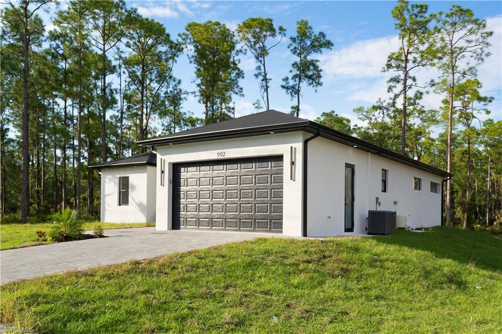 This elegant home also features a laundry room with quartz counters and custom cabinets, a two-car garage with a side access door, a paver driveway, and modern exterior lighting throughout.