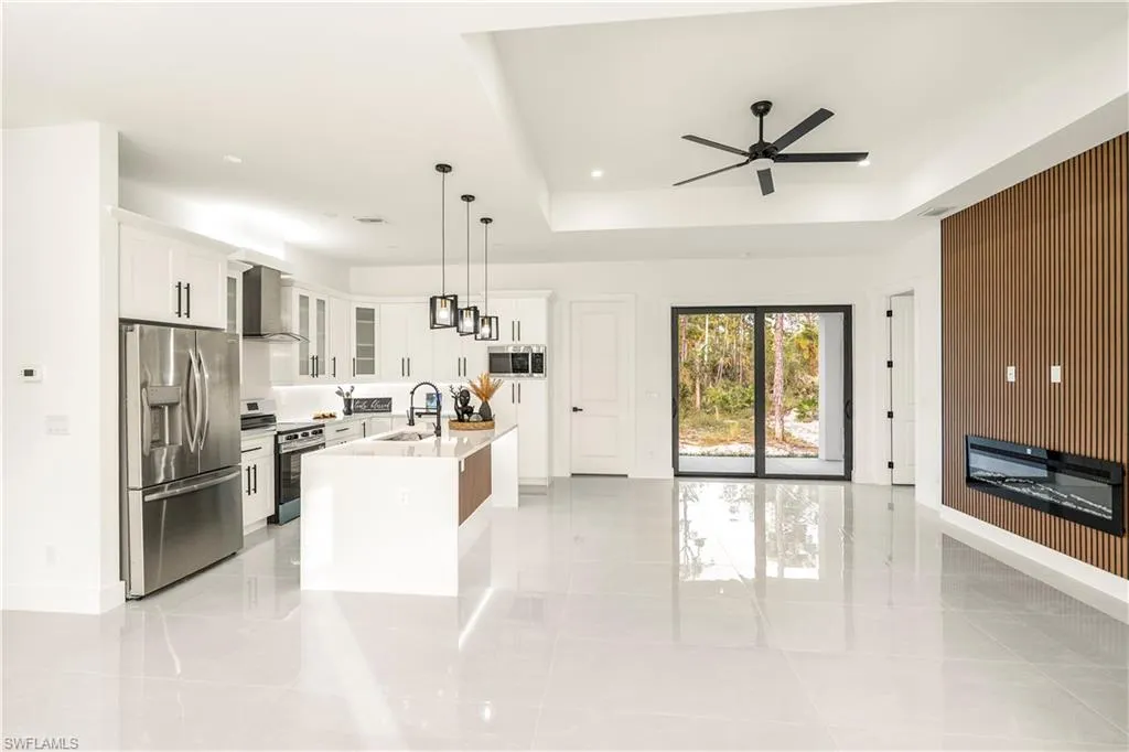 Additional highlights include a built-in electric fireplace, an accent wall that adds a touch of distinction, and an outdoor kitchen with quartz countertops and a gas cooktop — ideal for enjoying Florida’s sunny days.