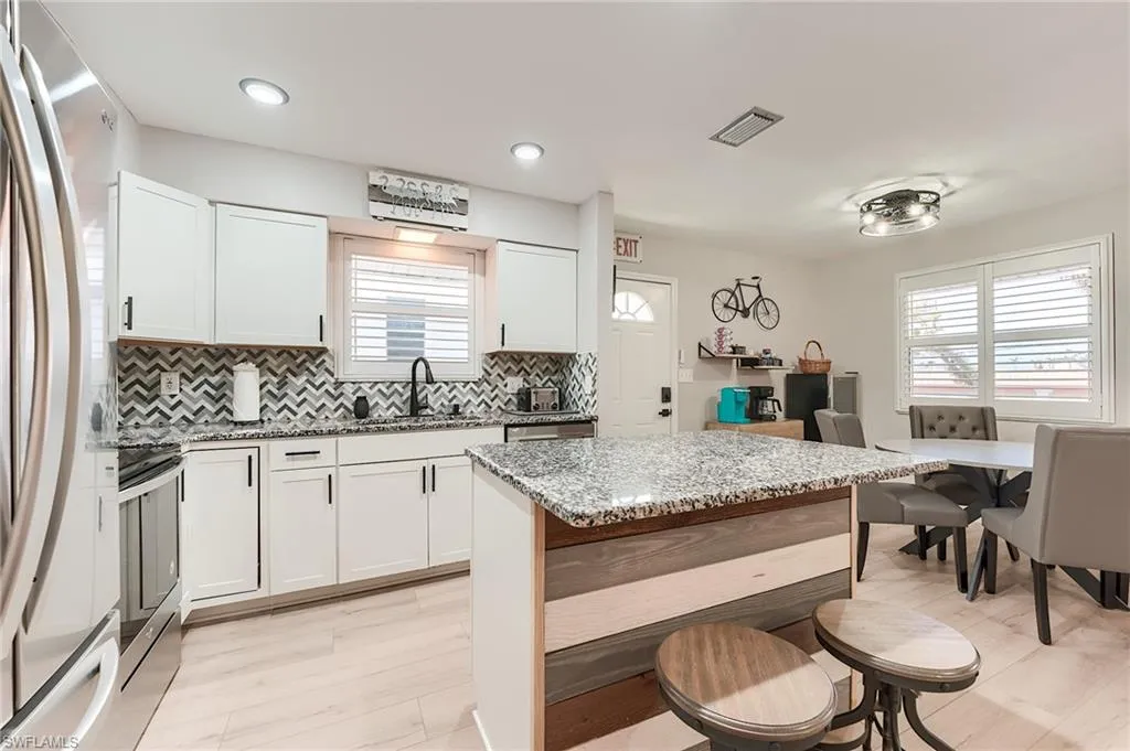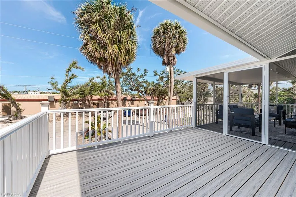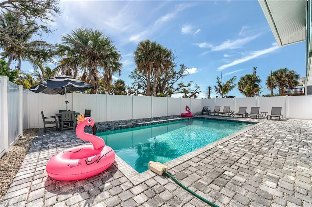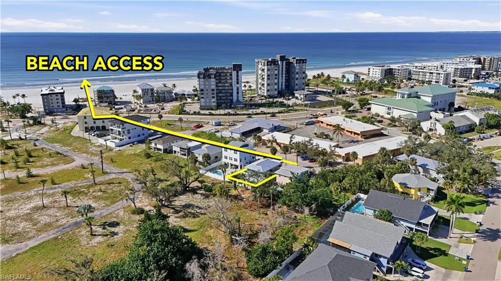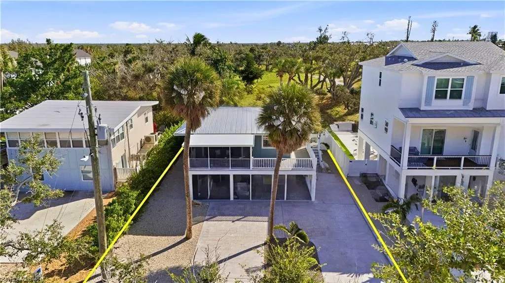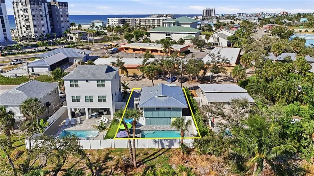 Coastal Cottage Retreat with Pool and Premier Beach Location! This rare Fort Myers Beach duplex combines island charm with stylish upgrades, offering the perfect balance of income potential and personal enjoyment. Ideally situated within the sought-after weekly rental zone and just a short walk to the Gulf, the property features a brand-new heated saltwater pool and two beautifully updated living spaces. The upper residence offers two bedrooms and two baths centered around an open living, dining, and kitchen design that opens to a screened lanai and newly constructed composite deck—ideal for relaxing or entertaining. The kitchen has been thoughtfully redesigned for both beauty and functionality, while each bathroom features contemporary tile, sleek vanities, and glass-enclosed showers. The lower level provides a bright one-bedroom, one-bath layout with a fully renovated kitchen, center island, and an open dining area that flows naturally into the living space. A screened lanai extends the coastal lifestyle outdoors, providing a comfortable place to unwind. The backyard oasis offers tropical landscaping, paver decking, and low-maintenance vinyl fencing surrounding the heated saltwater pool—creating a serene and private setting. Located near restaurants, beach bars, and local attractions yet away from the main bustle, this turnkey property is an exceptional opportunity for investors or those seeking their own slice of paradise on Fort Myers Beach.