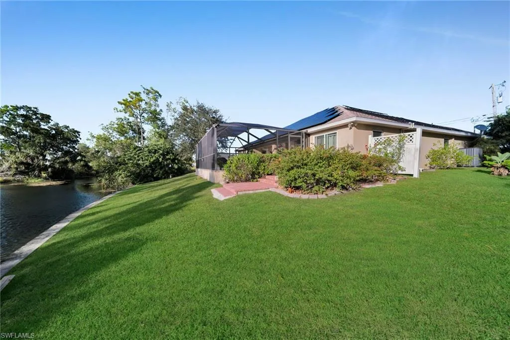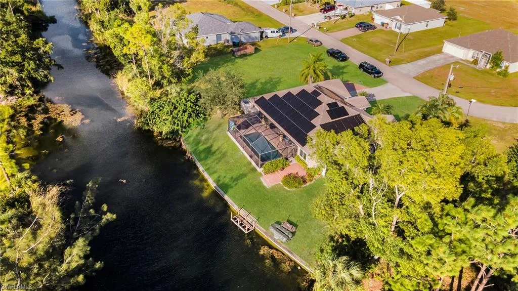 Stunningly Updated 4-Bedroom, 2-Bathroom WATERFRONT home located on the Edelweiss Canal in NE Cape Coral. Perfect for boating and Waterfront Living. This meticulously maintained ADAM HOME sits on an Oversized Corner Lot with *Mature Landscaping and your very own *Private Dock. Conveniently located just minutes to the new Aldi grocery store, Hwy 41, Shopping, Parks, and Dining, with EASY Access to Del Prado Extension, Public Golf Courses, and our famous Matlacha -“Old Florida Fishing Village” and Pine Island. And the best part? It’s in a *NO Flood Zone! *Newer Solar System, small Balance owing approx. $60,000; VERY LOW electric bills and significant long-term savings. You can Sell Unused energy back to the grid. *2023 Updates: *New Roof ($27,000) For Protection and Peace Of Mind for Years to Come, *Impact Windows for High-end protection and energy efficiency throughout,*New Laminate Vinyl Flooring in Bedrooms, *Designer Interior Paint, *New Garage Door Opener, *Whole House Reverse Osmosis System for Pure, filtered water at every tap, *Additional Recent Updates: *Wiring for Generator, *Pool Cage Screens, *New Hot Water Heater, *New Pool Pump and the *Lawn Irrigation System.