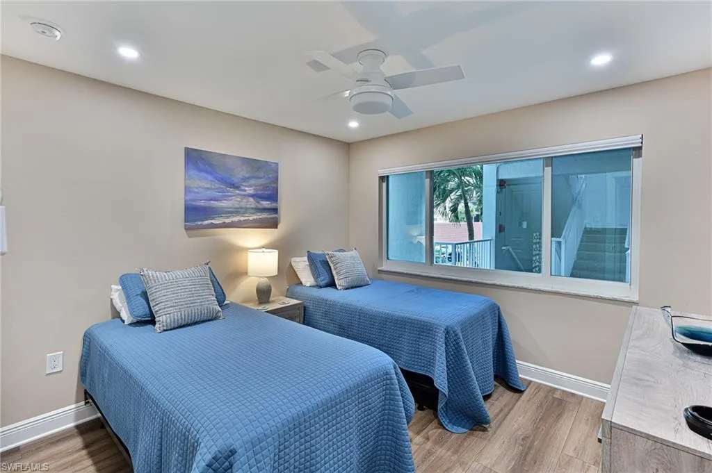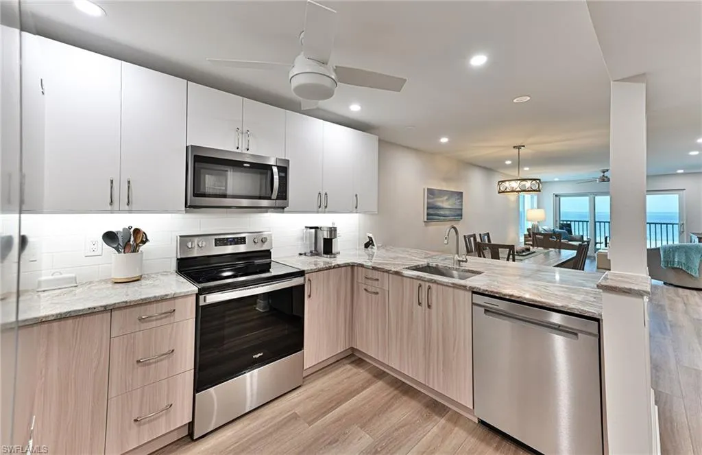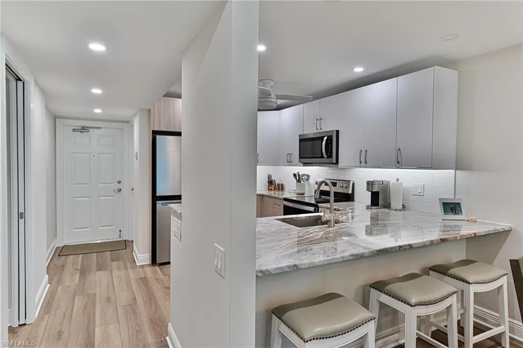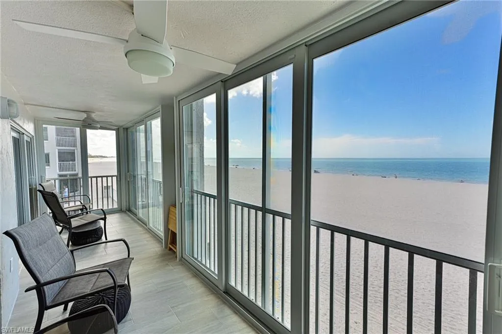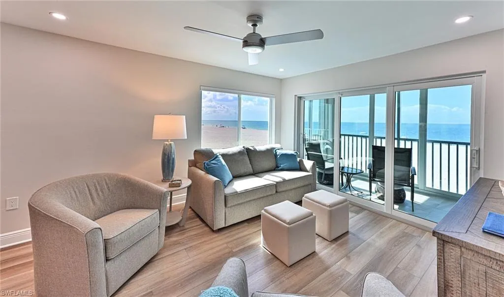This full renovated 2 bedroom 2 bath Casa Bonita I condominium on Bonita Beach offers panoramic views of the turquoise water and white sand beach of the Gulf where the beach is at its widest point. From the moment you walk in the front door you feel as though you entered a brand new luxury condo. The renovation was completed at a level seen in the new Bonita beach houses. It’s west and south exposure bring in light throughout as well as long views down the beach. The kitchen features custom two tone contemporary cabinetry and countertops plus upgraded stainless steel appliances and is open to the dining, living room and lanai with Gulf views from all. The dining room comfortably seats 6 plus another 3 at the open counter bar. The living room has a large south facing picture window, sliding doors to the screened in lanai, ample seating for entertaining and a large screen TV. The lanai is as wide as the condo with access from both the living room and the master suite for the ultimate views and sunsets. Sleep and wake up to the sounds of the Gulf from the master suite’s king bed. The master bath has been finished to the highest level of cabinetry, counters tile, plumbing fixtures, lighting and shower doors. The guest bedroom includes two beds and a bathroom finished to the same quality as the master bath. Impact windows and doors, mechanicals, electrical, plumbing, new light fixtures, new plumbing fixtures wood plank designer flooring and solid doors were all a part of the renovation. Best of all the turnkey furnishings are negotiable for an immediate closing and occupancy. Casa Bonita I is a well managed updated building and even the covered parking was renovated. Bonita Beach is centrally located to dining, entertainment, golfing, arenas in Bonita Springs and Naples and is close RSW Airport, the Promenade, Coconut Point, Mercato & Waterside Shops, Gulf Town Center.