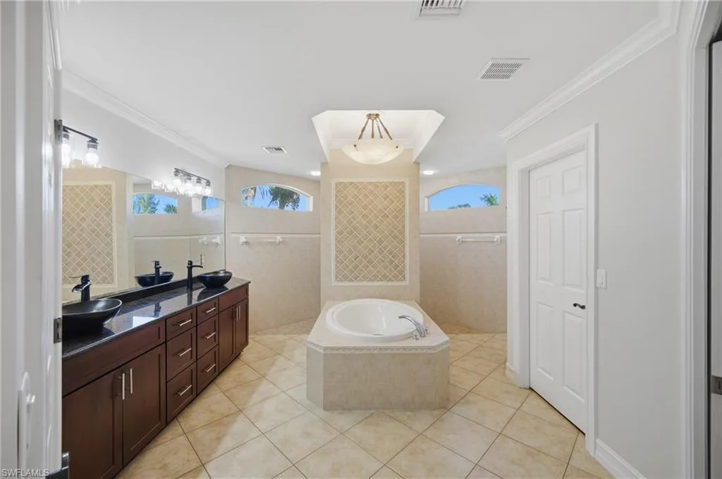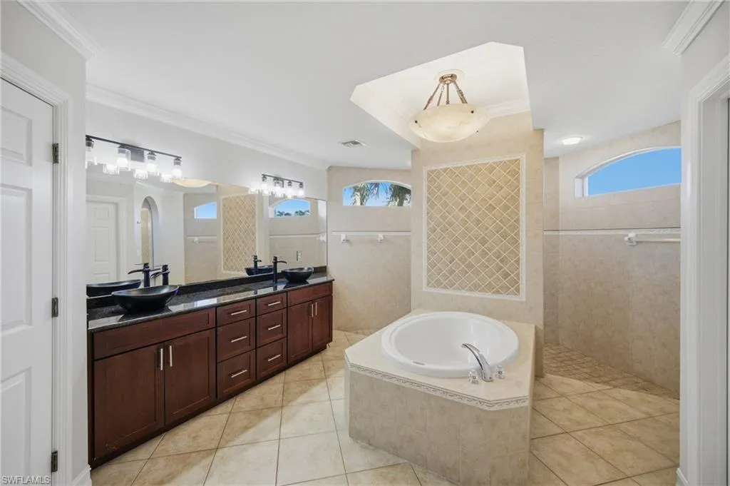 The primary suite offers two walk-in closets, dual sinks, a separate soaking tub, and a carriage walk-around shower, plus private lanai access for morning coffee by the pool.