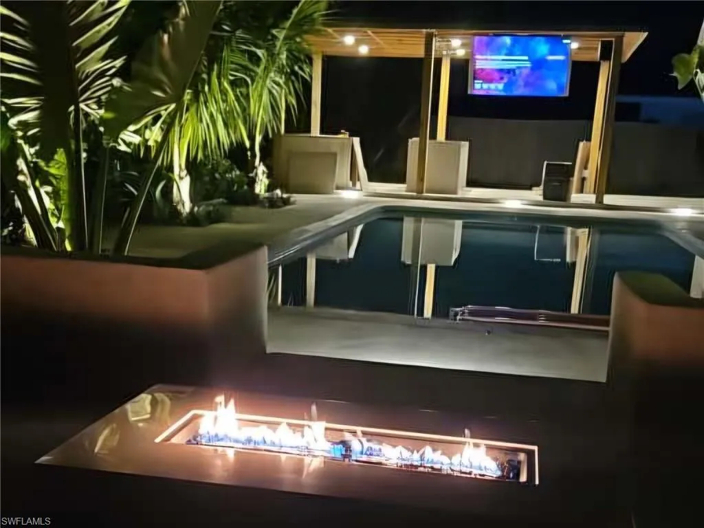 Step through the large Lanai and find your ultimate BACKYARD OASIS RETREAT, where resort-like landscaping surrounds a large, deep, fully refurbished pool. The entire area is set for entertainment, featuring outdoor speakers and illuminated by low-voltage LED lights for a perfect evening ambiance. The lanai seamlessly flows into a magnificent, large pergola that covers a full outdoor kitchen and a motorized TV mount, bringing the screen down exactly when you want it—perfect for NFL season and year-round Florida living! Opposite the pool is a dedicated sitting area complete with an instant-on propane fire pit for ideal ambiance on those cooler nights. An outdoor shower to rinse off before jumping into the pool.