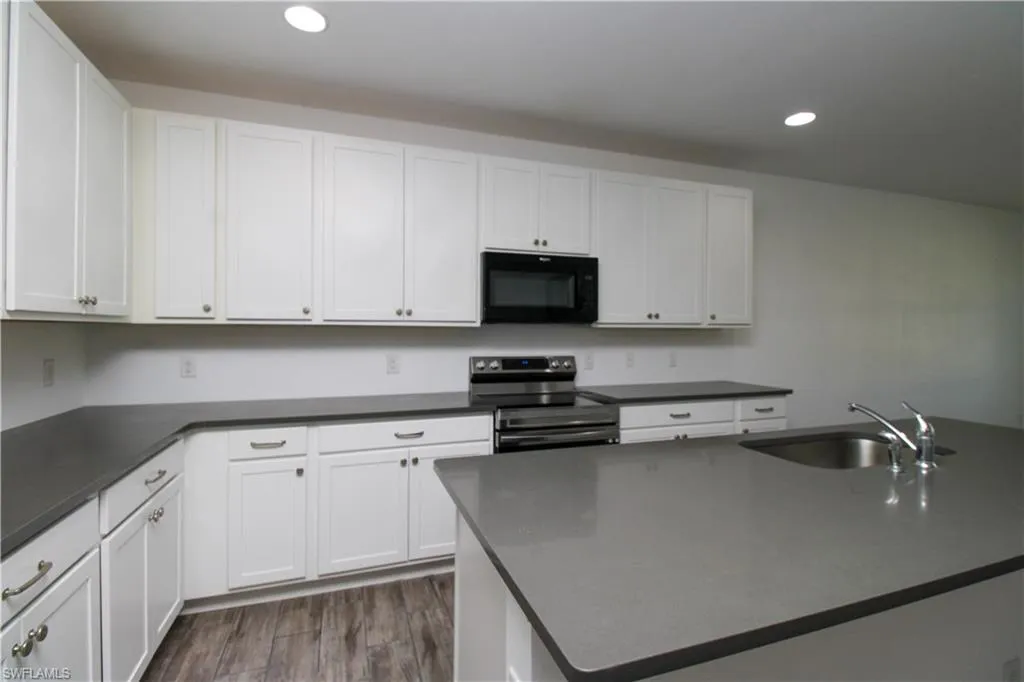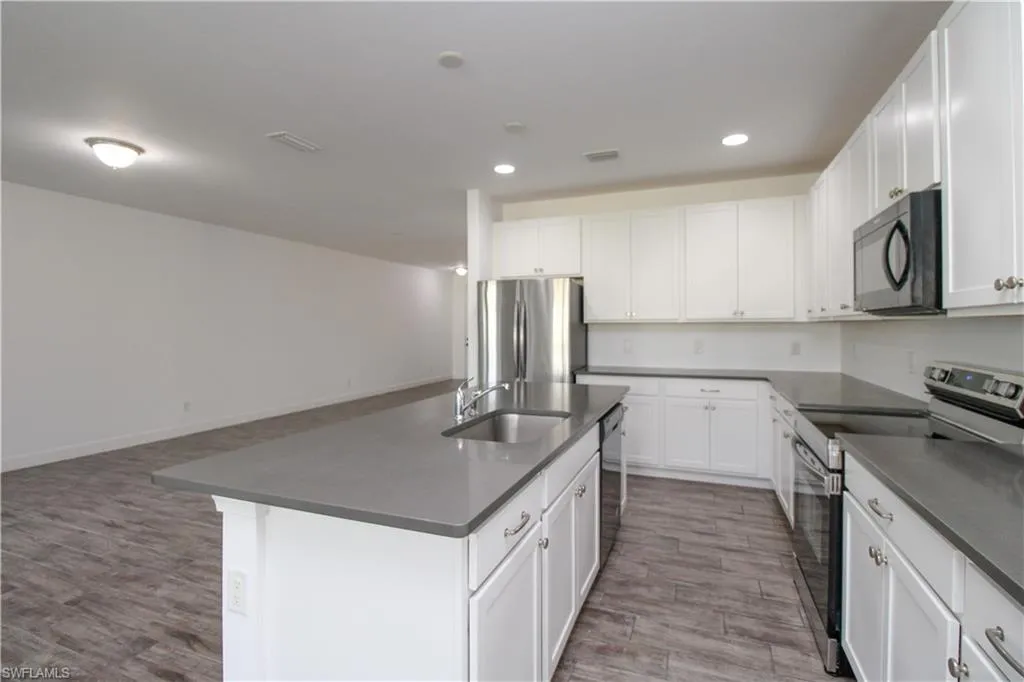 Open-concept kitchen with modern appliances and ample cabinetry.