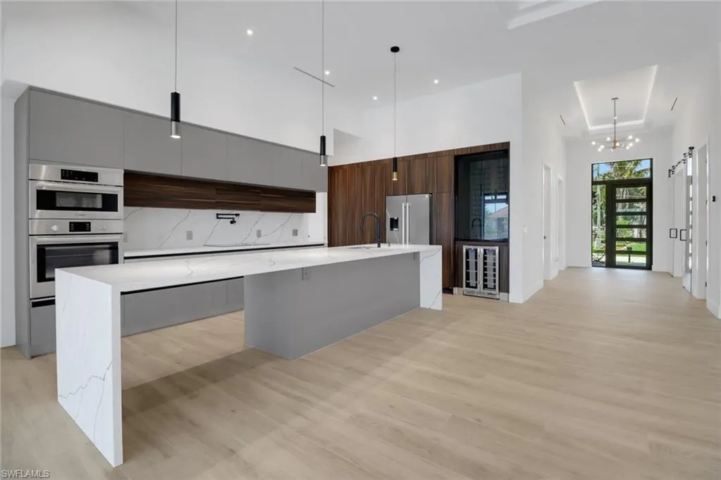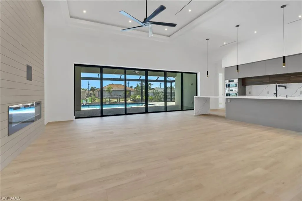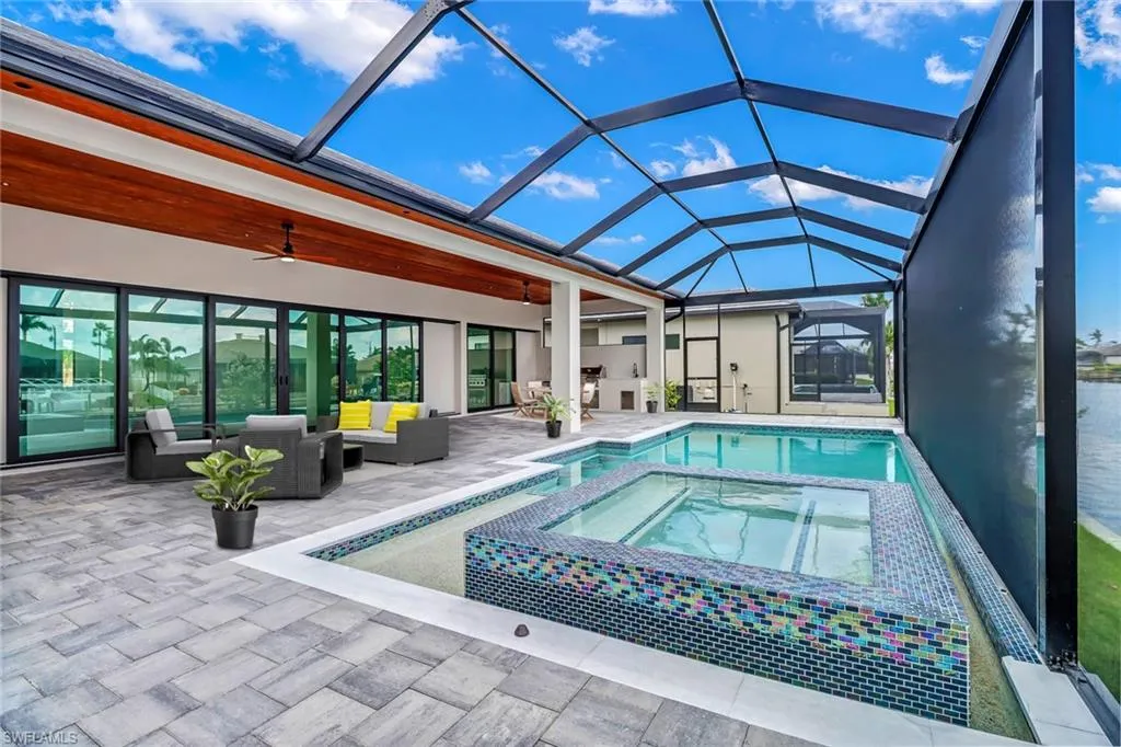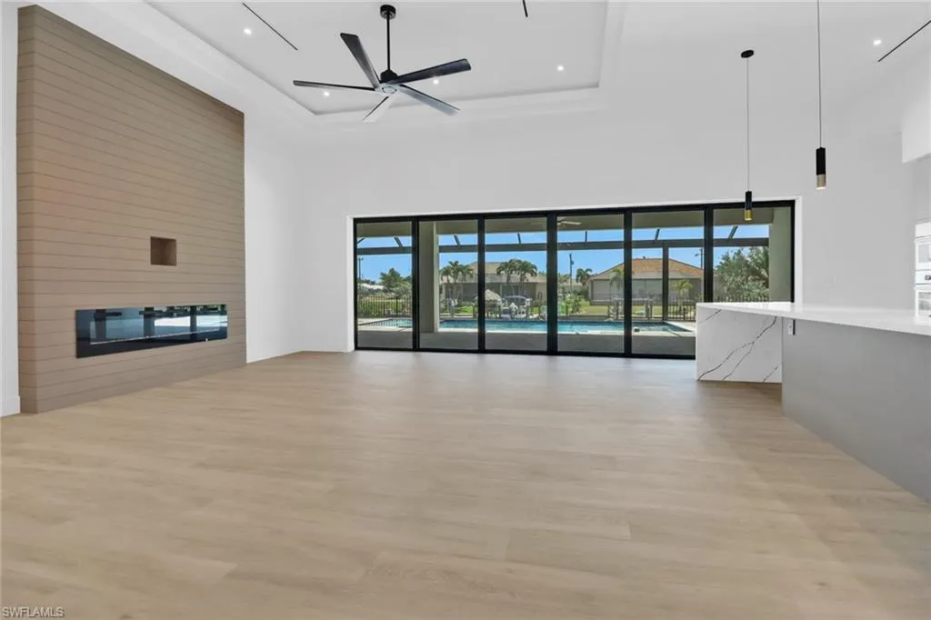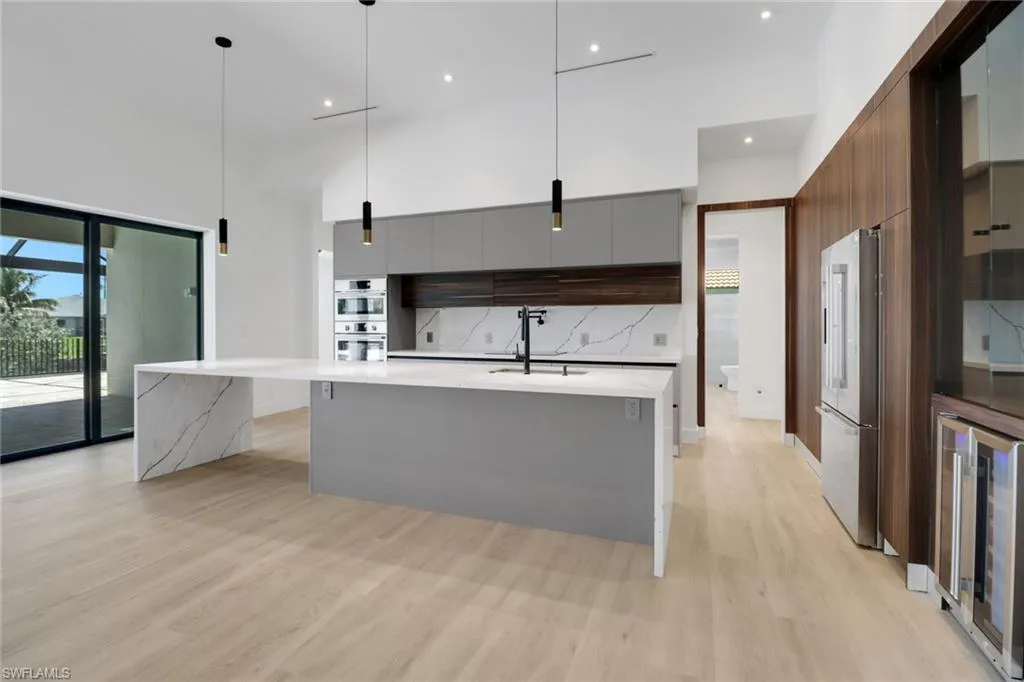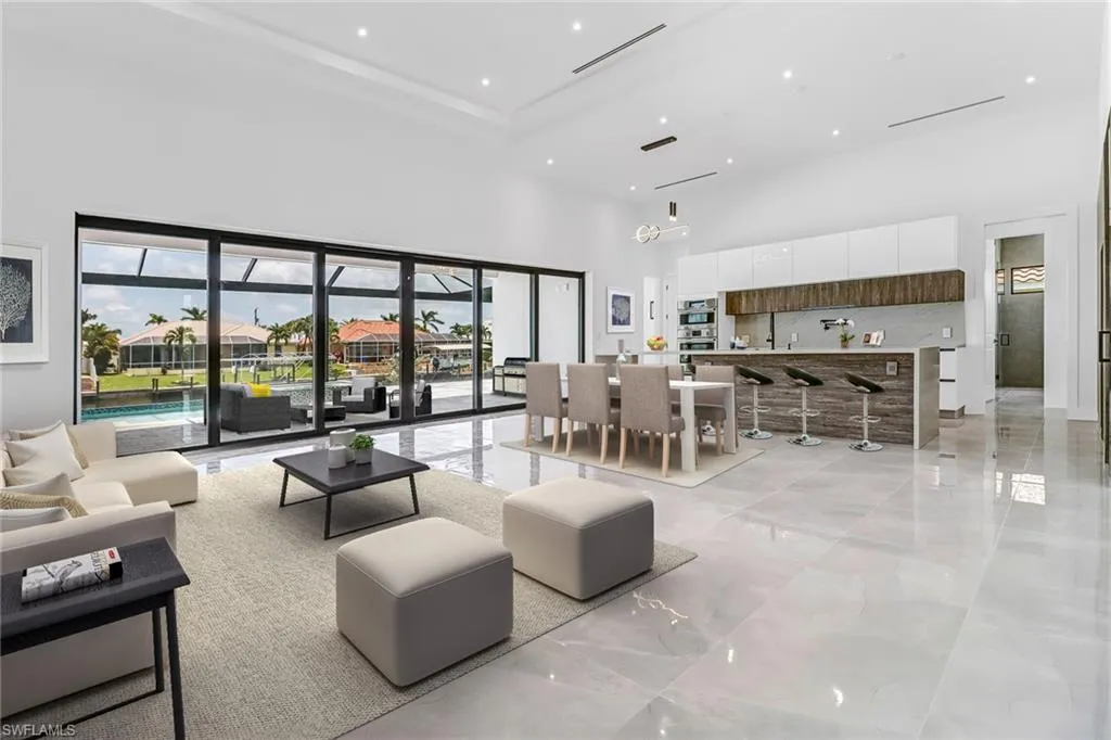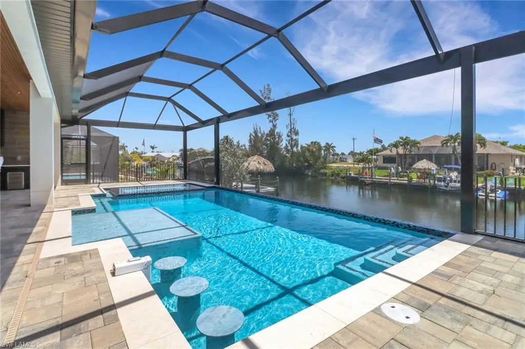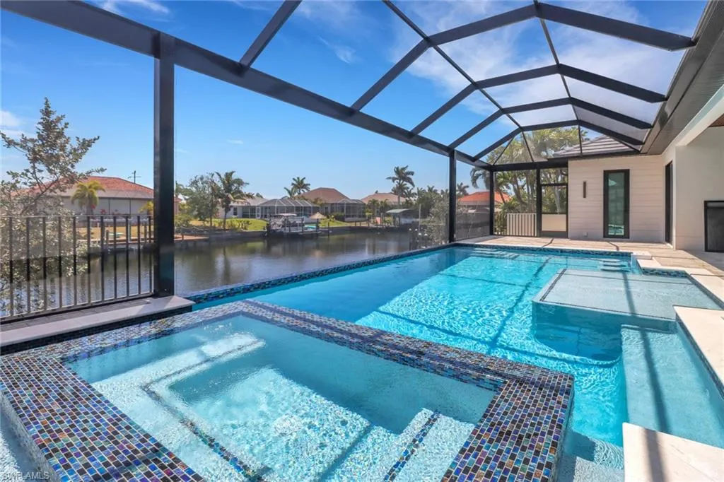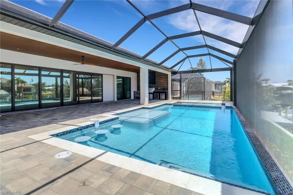 This brand-new stunning residence is nestled on a 115-foot-wide Gulf-access canal, offering ideal southern rear exposure—perfect for enjoying stunning sunsets and year-round sunshine. Spanning 2,844 sq. ft. of open-concept living, this thoughtfully designed home features 4 bedrooms, 3.5 bathrooms, and a versatile den/office. The sleek European-style kitchen is a chef’s dream, equipped with Bosch stainless steel appliances, a large center island with double waterfall quartz countertops, wine cellar and a seamless view of the expansive great room. Enjoy indoor-outdoor living through 23-foot-wide pocketing sliding glass doors that open to the oversized lanai. Step outside to your private outdoor oasis featuring a custom-designed saltwater pool with a stunning 360-degree spill-over spa adorned with sparkling glass tiles, color-changing LED lights, a sun shelf, and three built-in bar stools. Entertain effortlessly at the fully equipped outdoor kitchen, all beautifully framed by a 30-foot-wide panoramic screen that provides unobstructed water views. Interior upgrades include porcelain plank tile throughout, a dramatic 70” electric fireplace with a custom shiplap feature wall, soaring 14-foot tray ceilings with LED lighting, linear A/C diffusers, glass barn doors to the den, anti-fog backlit mirrors, and full glass shower enclosures. Additional highlights include LED floating entry steps, 3-car garage with epoxy flooring, and premium garage doors.