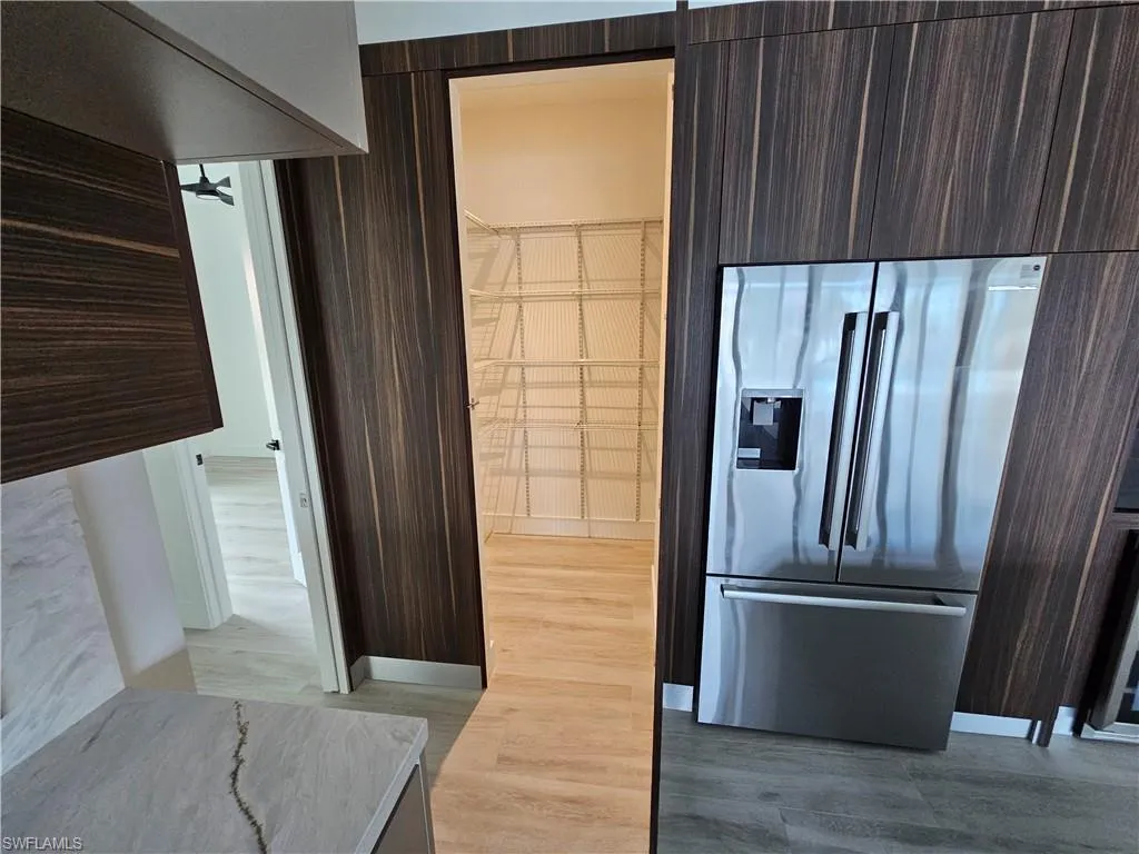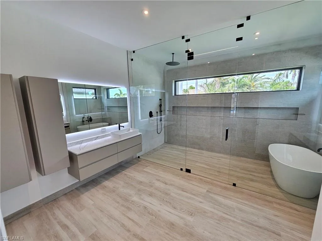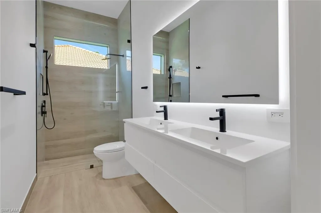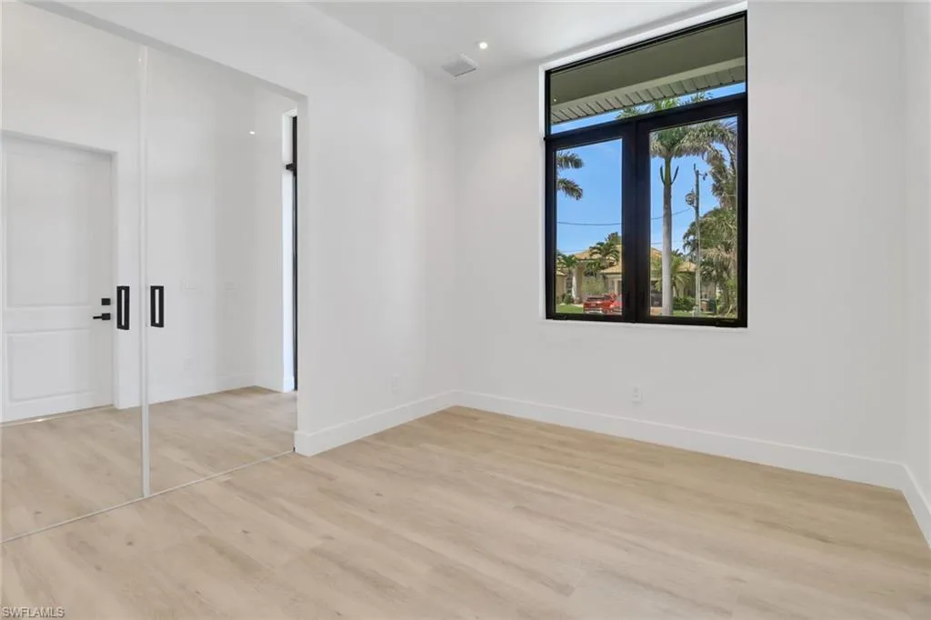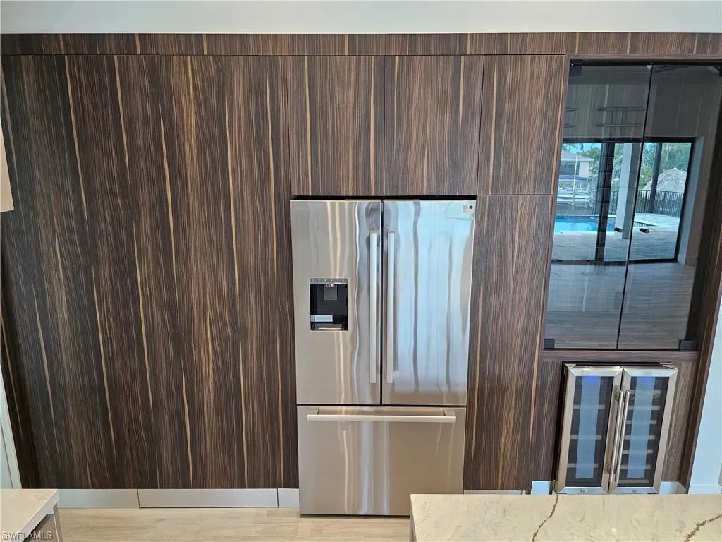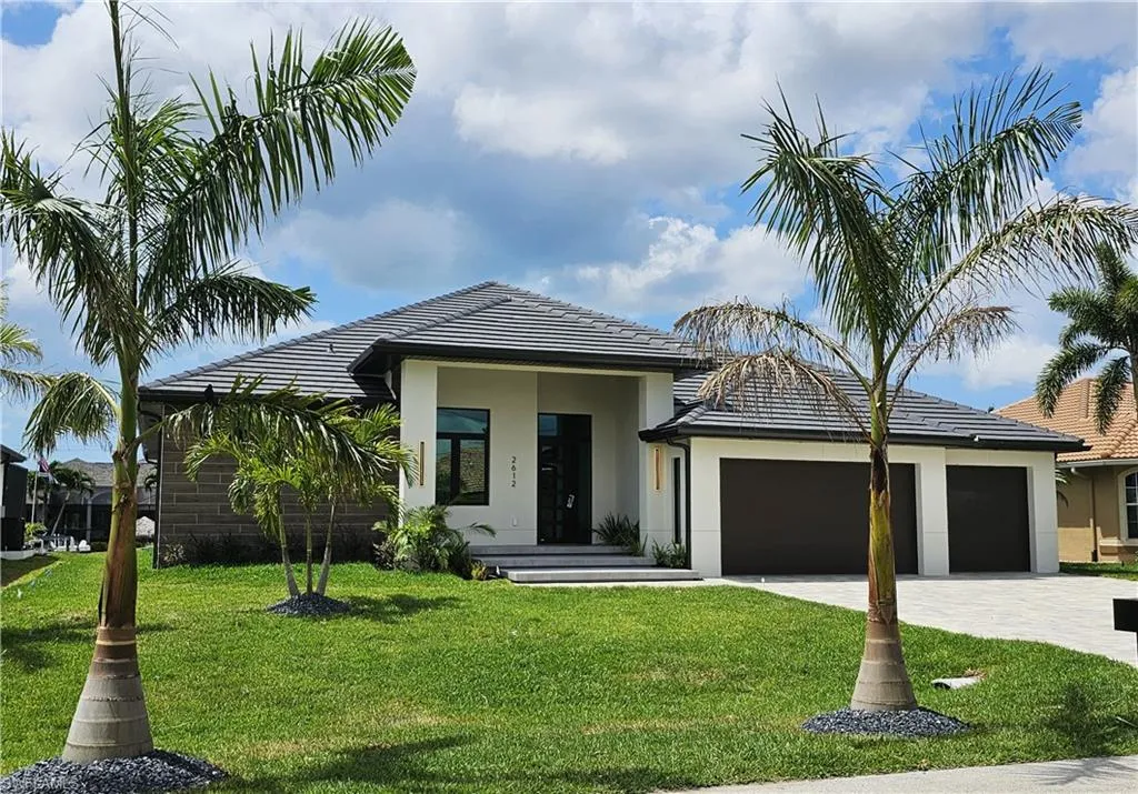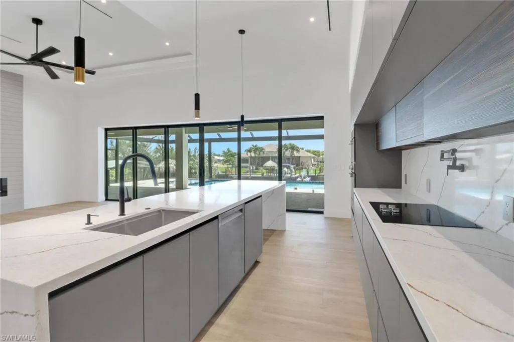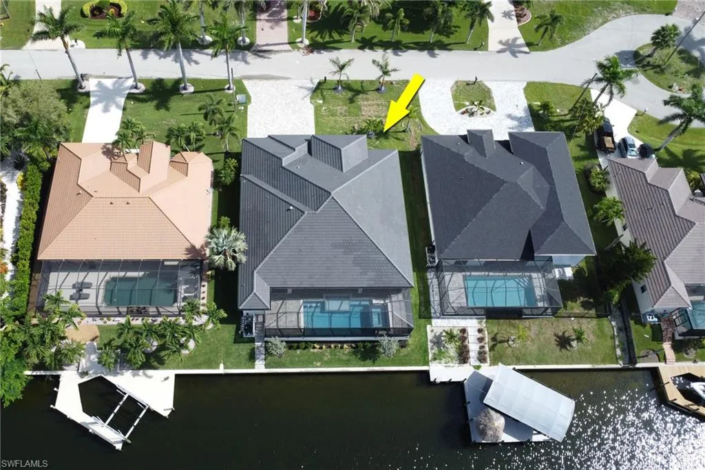 This brand-new stunning residence is nestled on a 115-foot-wide Gulf-access canal, offering ideal southern rear exposure—perfect for enjoying stunning sunsets and year-round sunshine. Spanning 2,844 sq. ft. of open-concept living, this thoughtfully designed home features 4 bedrooms, 3.5 bathrooms, and a versatile den/office. The sleek European-style kitchen is a chef’s dream, equipped with Bosch stainless steel appliances, a large center island with double waterfall quartz countertops, wine cellar and a seamless view of the expansive great room. Enjoy indoor-outdoor living through 23-foot-wide pocketing sliding glass doors that open to the oversized lanai. Step outside to your private outdoor oasis featuring a custom-designed saltwater pool with a stunning 360-degree spill-over spa adorned with sparkling glass tiles, color-changing LED lights, a sun shelf, and three built-in bar stools. Entertain effortlessly at the fully equipped outdoor kitchen, all beautifully framed by a 30-foot-wide panoramic screen that provides unobstructed water views. Interior upgrades include porcelain plank tile throughout, a dramatic 70” electric fireplace with a custom shiplap feature wall, soaring 14-foot tray ceilings with LED lighting, linear A/C diffusers, glass barn doors to the den, anti-fog backlit mirrors, and full glass shower enclosures. Additional highlights include LED floating entry steps, 3-car garage with epoxy flooring, and premium garage doors.
