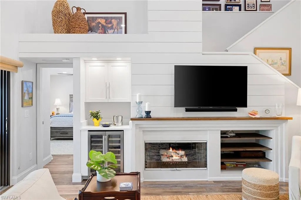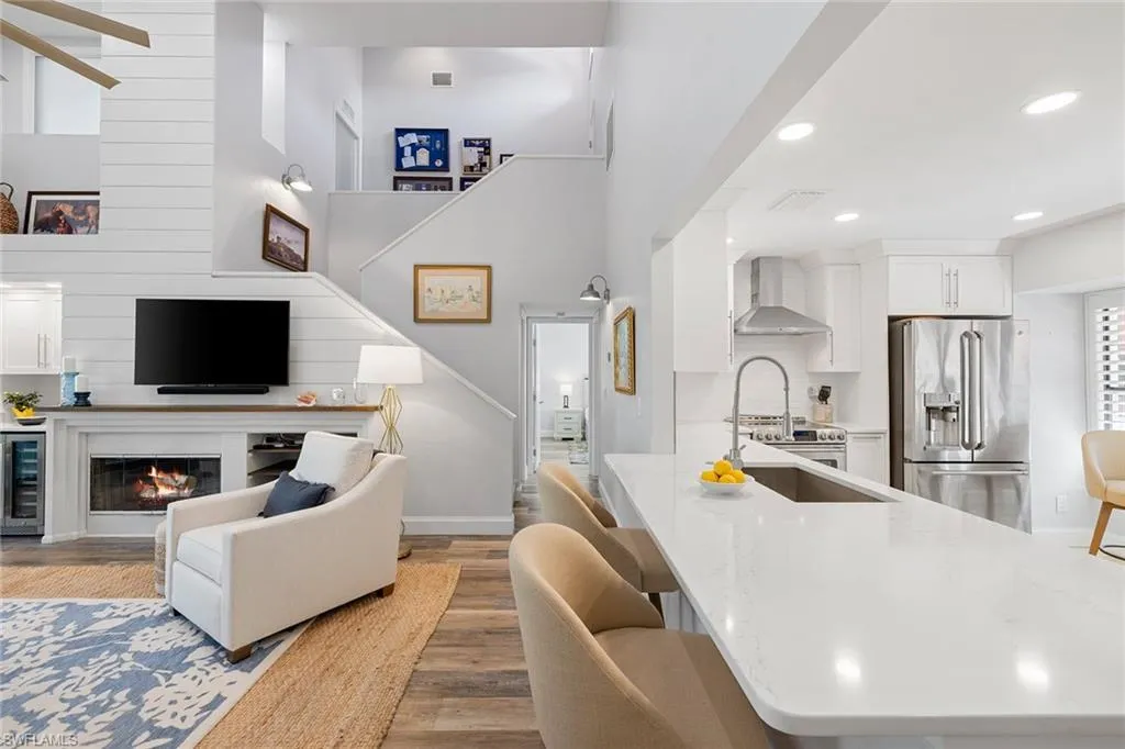 Fully updated, light and air three-bedroom three-bath multi-level condominium with tasteful coastal finishes. In the desired south end of Pelican Bay and lives like a private villa with a second-floor entrance and soaring 16-foot cathedral ceilings. Walk to Waterside Shops, dining, Artis-Naples and Baker Museum. Offered turnkey with exclusions. Featuring a new kitchen with quartz countertops, soft-close cabinetry, and Bosch & GE Café appliances. A large owner’s suite offers a spa-like bath with soaking tub, frameless glass shower, double vanity and dual walk-in closets. A junior suite and third bedroom with updated bath. The living room includes a fireplace, beverage cooler, impact glass sliders opening to a private lanai overlooking a peaceful lagoon, water feature, and one of two community pools. Extras include custom shutters, HVAC air purifier, new roof, updated electrical and fresh exterior paint. Pet-friendly and charming home in amenity-rich Pelican Bay with private beachfront cabana service, dining, tennis/pickleball, fitness and vibrant social scene. It’s all ready for you! Just pack your sunscreen.