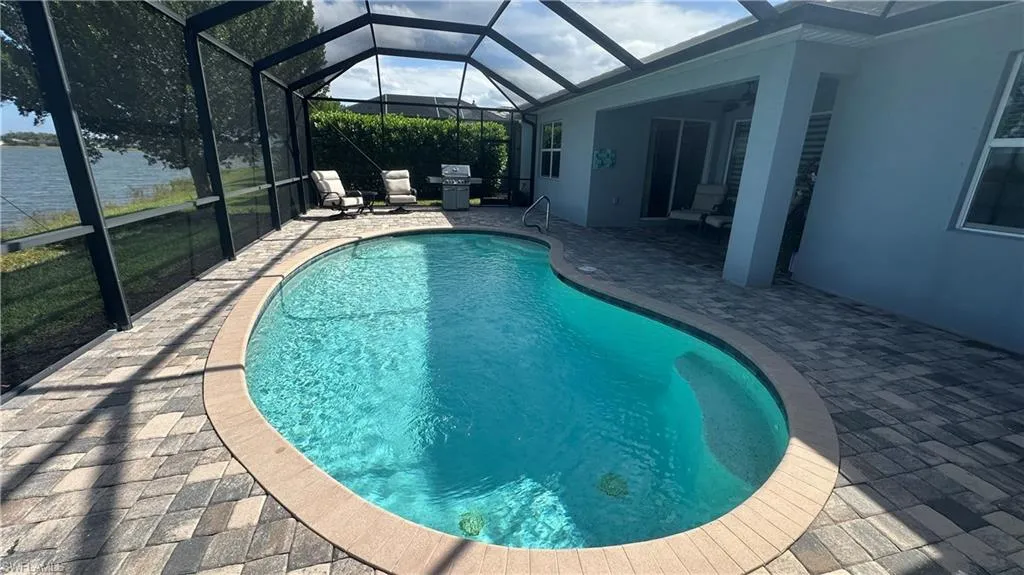 LAKESIDE POOL, SUNSETS, SUNRISES, and a 3 CAR GARAGE!! This 6 year new, highly sought-after Summerville model will check all the boxes!! 3 large Bedrooms plus DEN, including a Guest suite w/private bath, 3 FULL Baths, 2445 sf of bright, light living spaces, Lakeside POOL and 3 GAR GARAGE!! Enter through your double-door entry into the bright foyer with custom wall accents and immediate views of the Lake! The huge Great room is open to the Kitchen featuring HUGE Kitchen Island, tons of counter space, walk-in pantry, and eating area with lake views. Sliders with custom auto-blinds lead you out to the Florida setting you won’t want to leave, complete with screened Lakeside POOL and Lanai, and sunsets that never get old! NEW A/C, NEW FRIDGE, Newer Pool Pump!! Located in a quiet area of Southwest Florida away from the hustle and bustle, this community has NOT experienced storm surge or major damage from the past 3 major Hurricanes! NO FLOOD insurance is required! Only 11 quick miles to the beautiful GULF BEACHES!! Enjoy BIG LAKE VIEWS with community fishing pier, kids play park, community gathering park, tennis court/basketball hoop, and low HOA fees that include Cable/internet, Lawncare & irrigation, and more! Across the road from CREW Flint Preserve and Hiking Trails and only 11 miles to the beautiful Gulf Beaches!! NEW *MIDTOWN AT BONITA* BEING BUILT JUST DOWN THE ROAD, featuring shopping, restaurants, etc.! This home has all the great features you’d want, and the comfort of living in a quaint, welcoming, community with only 219 homes. Enjoy Florida and all that it has to offer!