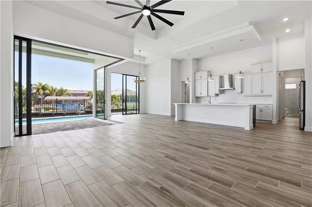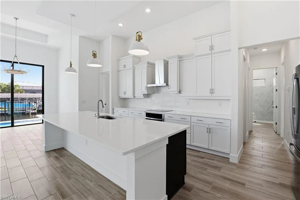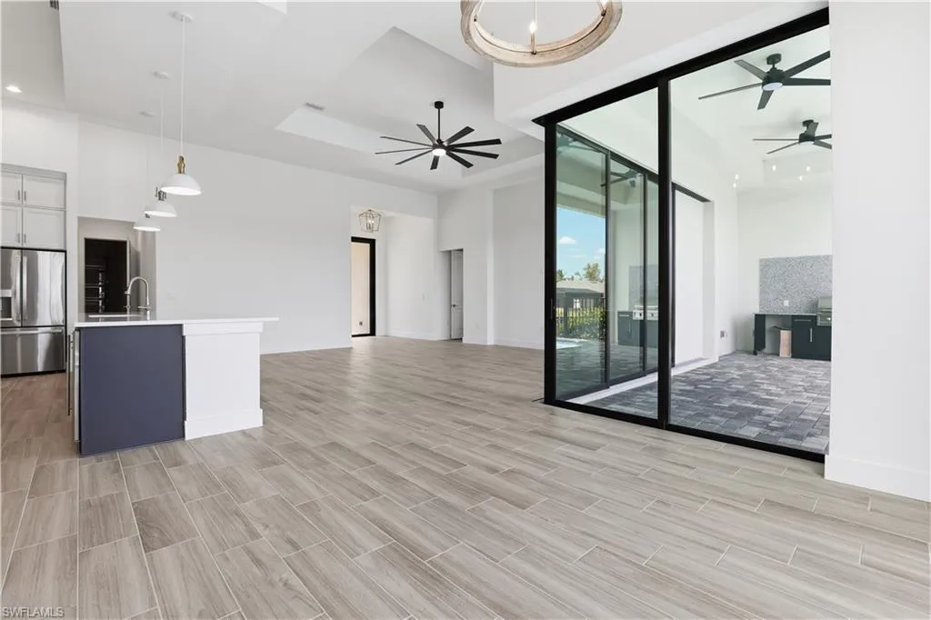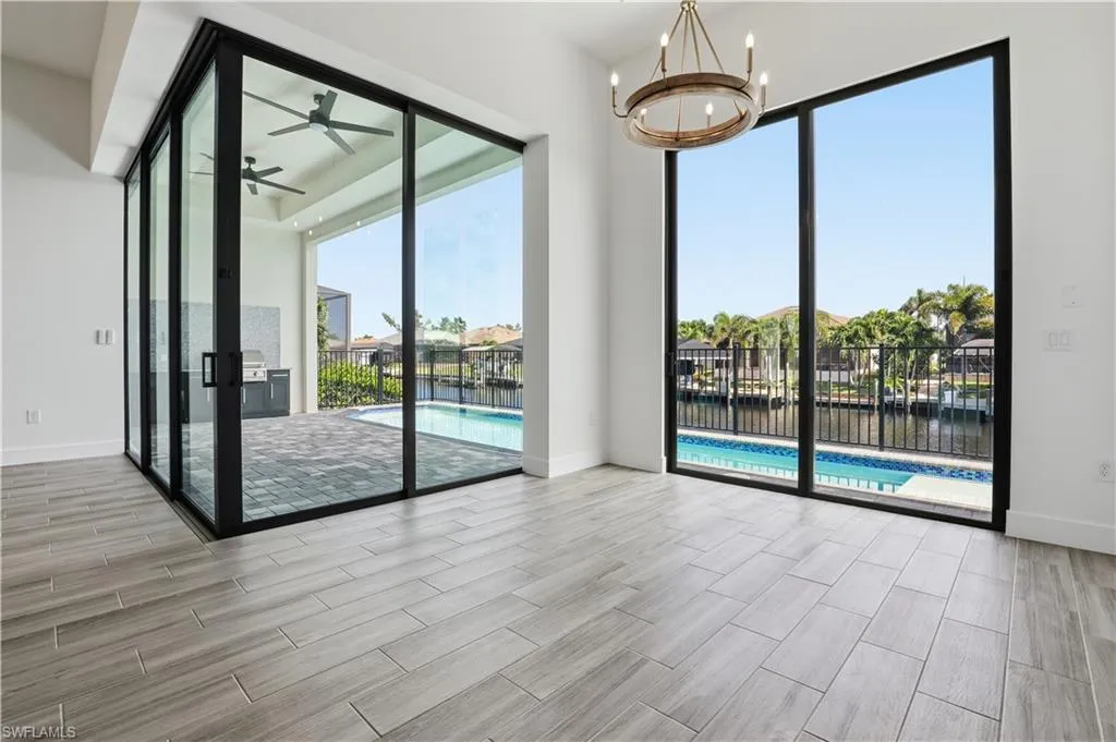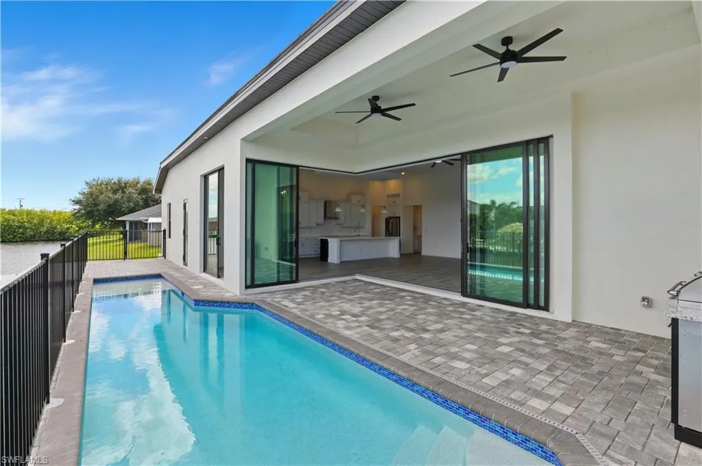 Experience luxury waterfront living in this brand-new 2025 Gulf Access pool home! This modern residence offers 4 bedrooms plus a den, 3 full bathrooms, and a 3-car garage, featuring 2,614 sq. ft. of thoughtfully designed living space on a quiet cul-de-sac with a 100-ft wide canal view. Designed with an open great-room layout, the home features volume ceilings with seven tray accents up to 14.5 ft., wood-look plank tile flooring throughout, and high-end finishes. The chef’s kitchen includes a 12-ft quartz island, white shaker cabinets, stainless steel appliances, walk-in pantry, and a spacious dining area—perfect for both entertaining and daily living. Expansive 90-degree pocket sliding doors open the living area to the outdoor lanai, complete with a summer kitchen, grill, and a sparkling heated pool overlooking the Gulf Access canal. The private primary suite offers a spa-style bath with soaking tub, dual vanities, and an oversized walk-in closet. Guest accommodations include two bedrooms sharing a full bath plus an additional en-suite bedroom that doubles as a pool bath.