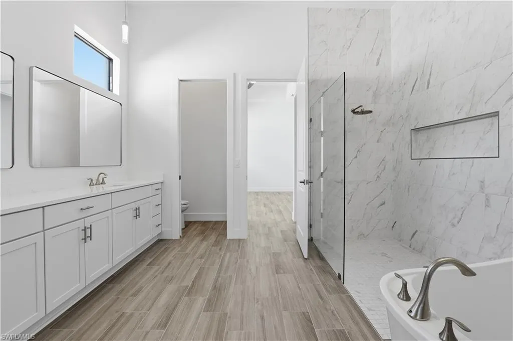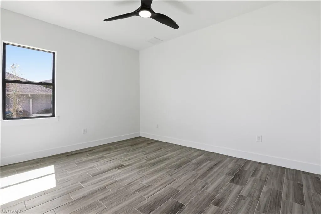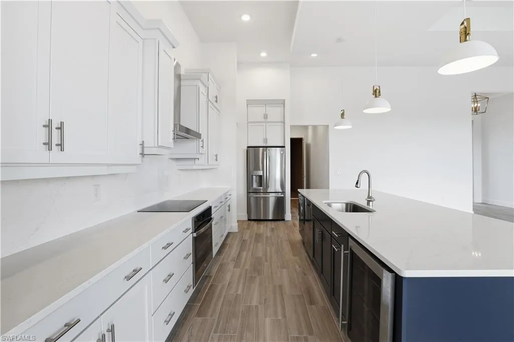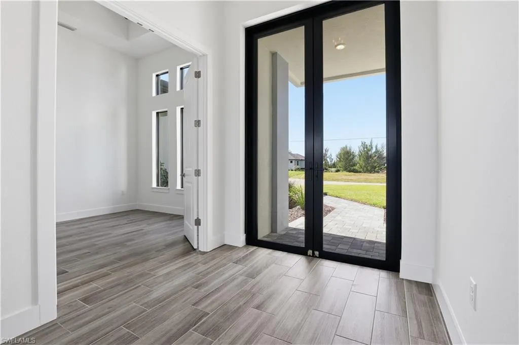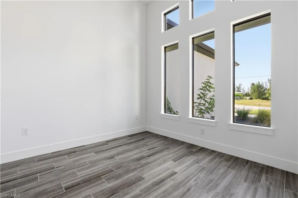 Experience luxury waterfront living in this brand-new 2025 Gulf Access pool home! This modern residence offers 4 bedrooms plus a den, 3 full bathrooms, and a 3-car garage, featuring 2,614 sq. ft. of thoughtfully designed living space on a quiet cul-de-sac with a 100-ft wide canal view. Designed with an open great-room layout, the home features volume ceilings with seven tray accents up to 14.5 ft., wood-look plank tile flooring throughout, and high-end finishes. The chef’s kitchen includes a 12-ft quartz island, white shaker cabinets, stainless steel appliances, walk-in pantry, and a spacious dining area—perfect for both entertaining and daily living. Expansive 90-degree pocket sliding doors open the living area to the outdoor lanai, complete with a summer kitchen, grill, and a sparkling heated pool overlooking the Gulf Access canal. The private primary suite offers a spa-style bath with soaking tub, dual vanities, and an oversized walk-in closet. Guest accommodations include two bedrooms sharing a full bath plus an additional en-suite bedroom that doubles as a pool bath.