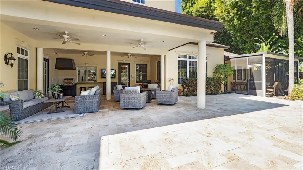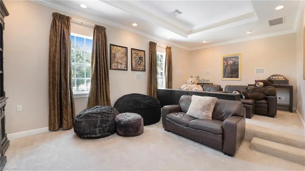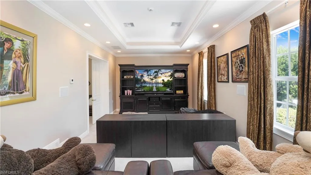 The backyard is a private retreat, featuring a sparkling pool, inviting gazebo, expansive covered patio perfect for entertaining, and a fully equipped outdoor kitchen. The lush, tropical landscaping and mature trees create a serene oasis with complete privacy from neighboring homes. The home features an incredible media and game room perfect for entertaining.