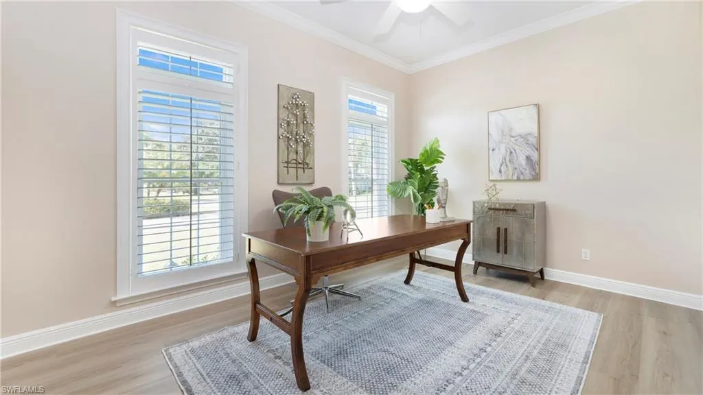 The primary suite is truly a sanctuary—boasting dual vanities, an oversized walk-in shower, a luxurious soaking tub, and two enormous closets with floor-to-ceiling storage. Step out onto your private screened lanai, the perfect spot for morning coffee or evening relaxation.
