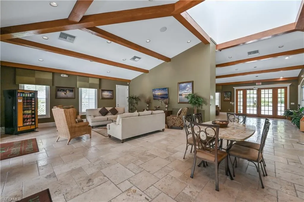 Open-plan living/dining area that flows seamlessly to a screened lanai — perfect for enjoying morning coffee or a sunset glass of wine while overlooking the lake and golf course.