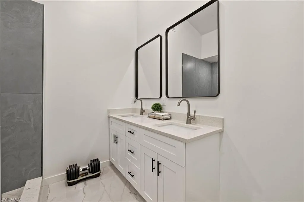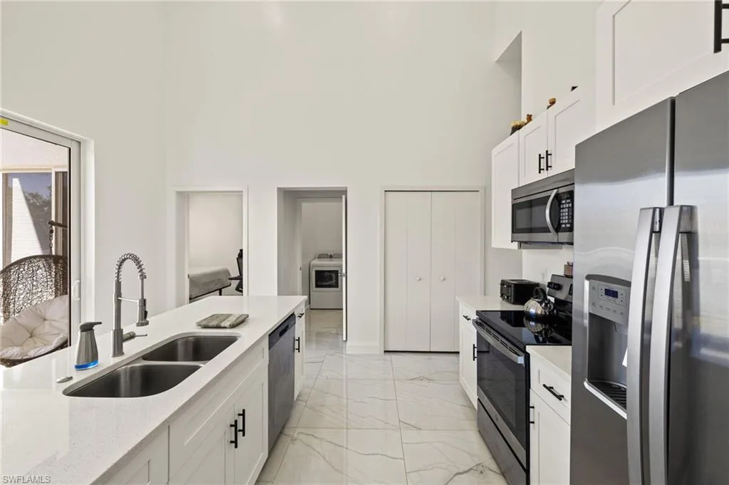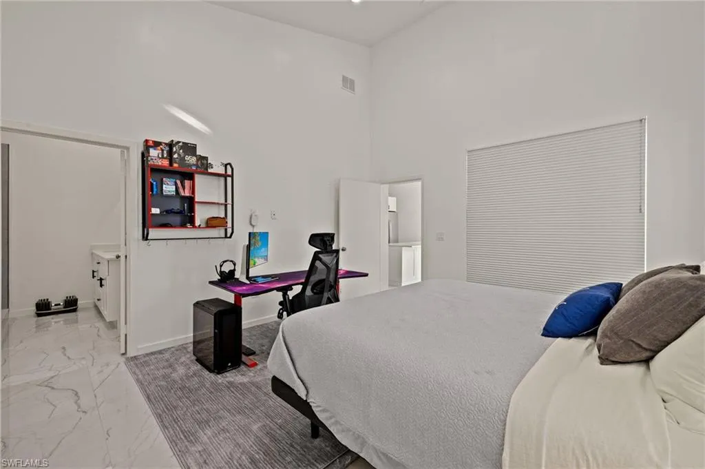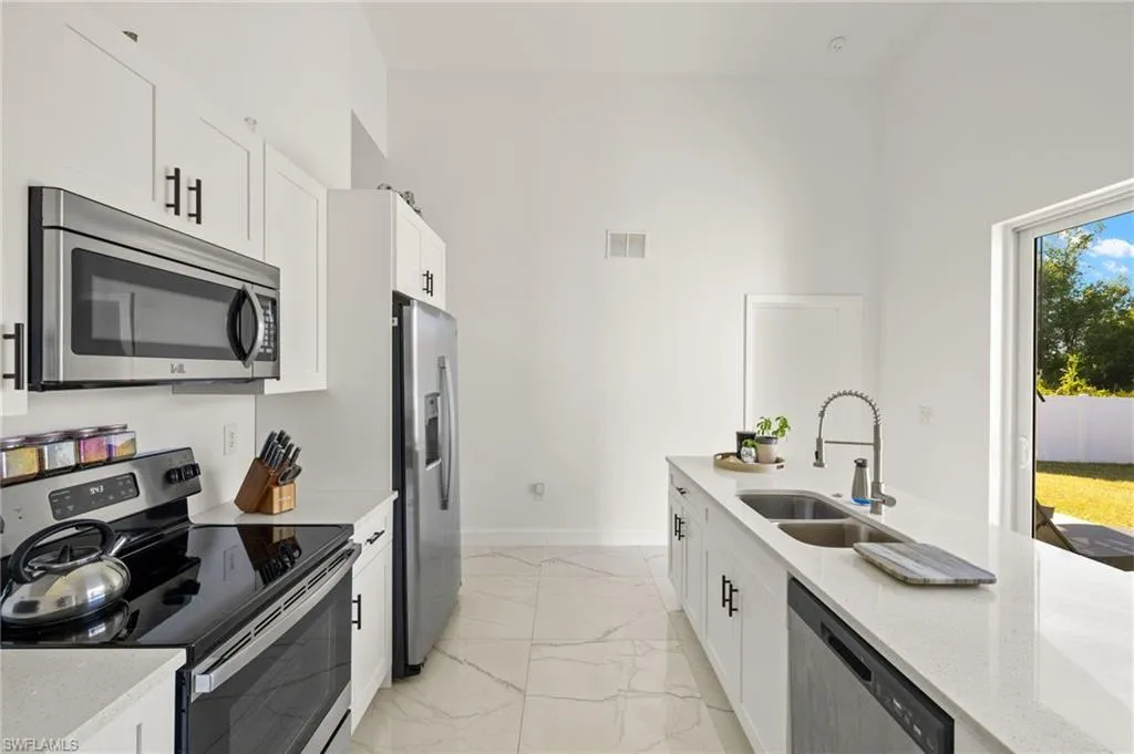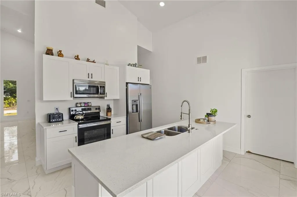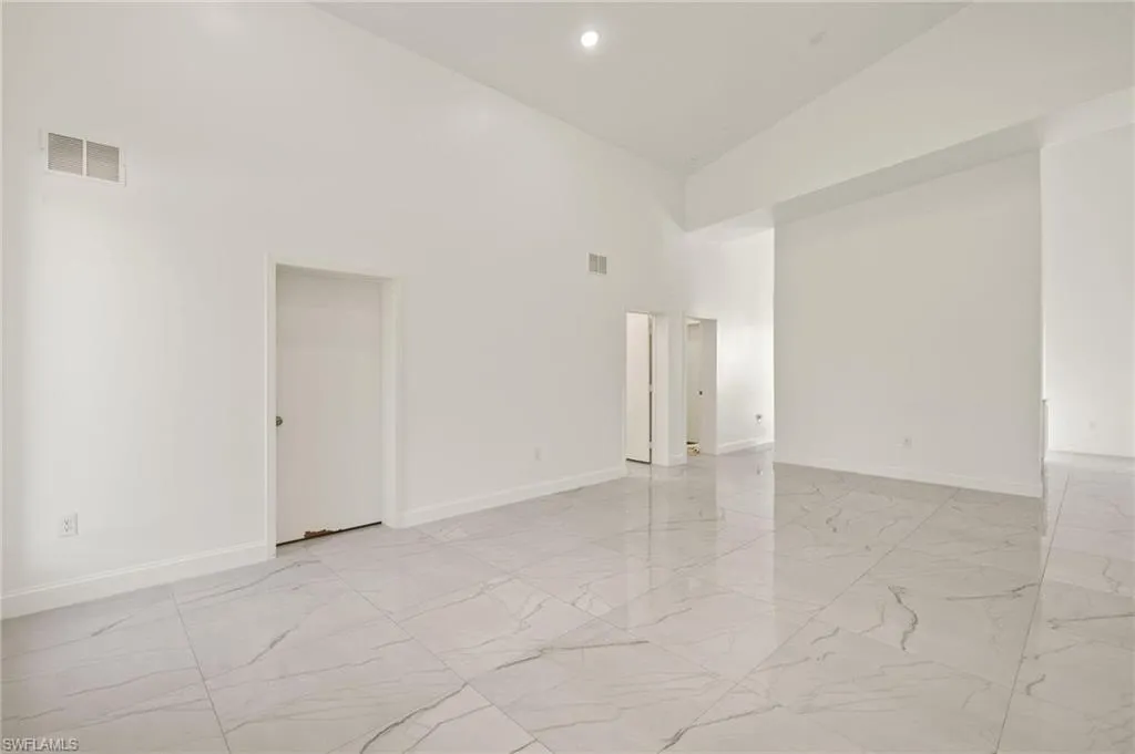 Built with the future in mind, no attic home was designed to stay cooler and reduce maintenance, especially important in hot Florida climates. Homes without an attic means fewer thermal barriers between the roof and the living space, high ceilings allowing hot air to rise above the living zone, eliminating unused or cluttered storage space, encouraging efficient design, less space to insulate and cool, so your air conditioning system works less, energy bills are usually lower because of reduced heat gain. Open floor plan offers main bedroom ensuite with a large shower and double quartz vanity, a 13ftx5 ft walk in closet. There are 2 bedrooms separated by a Jack-and-Jill bath and an office. Kitchen has all SS appliances as well as food disposal and a 9Lx3W ft quartz top island and a walk in pantry. The entire home has vaulted, high ceilings, recessed lights, 30×30 ceramic tiles. The sloped roof is more compatible with rooftop solar panels. Fully Fenced home.