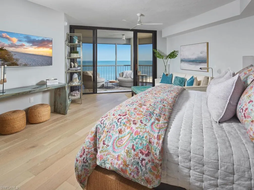 This impeccably maintained and tastefully updated turnkey furnished home features elegant wood flooring throughout. Floor-to-ceiling windows and sliding glass doors fill the space with natural light and open to two screened terraces, the primary suite and living room overlooking the white sandy beach and the waters of the Gulf of America, the kitchen and guest bedroom capturing the glittering skyline and serene beauty of Venetian Bay.