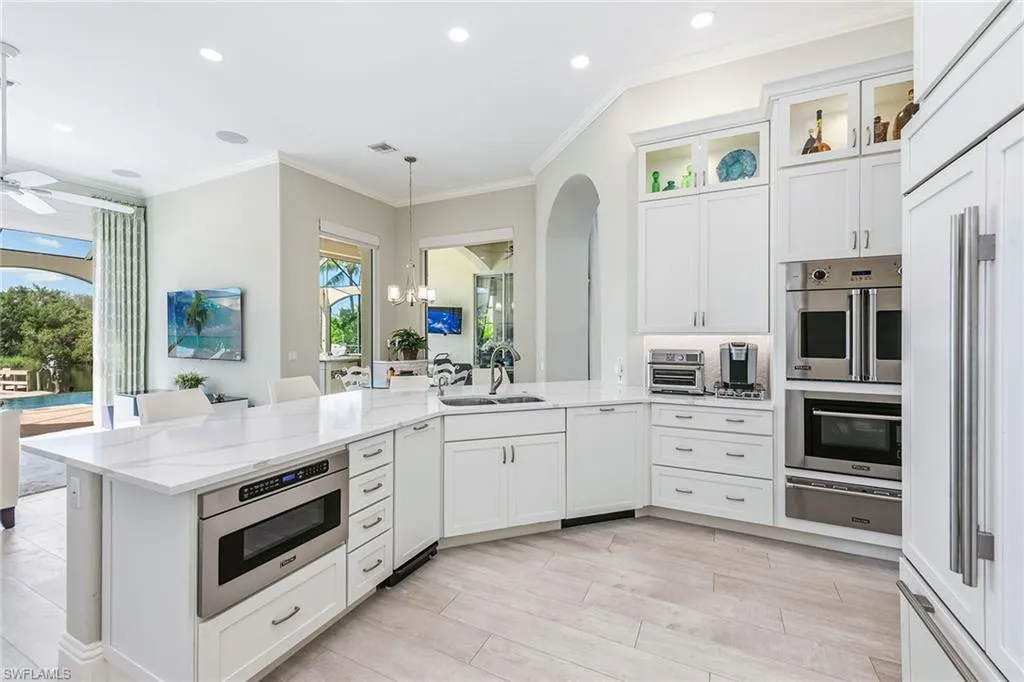 Rarely available, on the creek with private dock! Experience the ultimate in waterfront luxury with this beautifully designed two-story residence in the prestigious Bellagio village of Fiddler’s Creek, ideally at end of a private street with water on two sides, offering exceptional privacy and breathtaking wide-water views. Positioned directly on the Creek with its private dock for an electric boat, this home provides effortless access for sunset cruises, boating and fishing right from your backyard. With desirable southwest exposure, this home enjoys brilliant sunsets and natural light throughout the day. The outdoor area impresses with an expanded infinity-edge pool with a larger footprint than the norm, paved deck, screened enclosure with concrete columns and a covered lanai featuring a granite-topped summer kitchen with Lynx grill, sink and beverage refrigerator, blending relaxed living with the Naples indoor-outdoor lifestyle. Electric storm shutters cover all windows along the back of the home, providing added peace of mind. Inside, refined craftsmanship shines throughout, from the grand mahogany double-door entry to volume ceilings, arched walkways, crown molding, recessed lighting and wood-look porcelain tile floors. The chef’s kitchen impresses with sleek white cabinetry, quartz countertops, glass-front displays and premium Viking stainless steel appliances, including a gas cooktop, convection oven, steamer, warming drawer and paneled refrigerator. Additional features include a KitchenAid trash compactor and an Insinkerator instant hot water system, making this kitchen as functional as it is elegant. A bright breakfast area overlooks the water, while the adjacent family room impresses with built-in speakers, electric blinds and glass sliders opening to the lanai. A formal dining area and an elegant living room, complete with arched transom windows and a wet bar featuring a granite countertop, sink, and TCL beverage refrigerator, create a seamless flow for entertaining. A convenient powder bath off the hallway near the living room adds comfort and functionality for guests. The main level also includes a tranquil owner’s suite with two walk-in closets fitted with wood shelving and a luxurious en-suite bath offering a quartzite vanity with dual sinks, a makeup area, framed mirrors, a soaking tub and a glass-enclosed walk-in shower. A spacious guest bedroom and private den with custom finishes share a stylish Jack and Jill bath with a glass-enclosed shower. Upstairs, an elegant staircase leads to two guest suites, each with an en-suite bath, and a tiled balcony overlooking the pool and tranquil creek. Additional highlights include a Savant home automation/ security system offering 24-hour monitoring and control of lighting, front door and pool temperature, impact glass, tile roof, 2022 water heater, 2021 HVAC and an air-conditioned garage. Enjoy the exceptional amenities of Fiddler’s Creek!