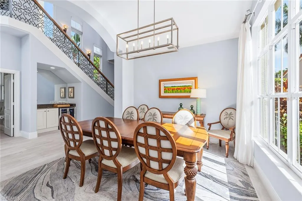 Rarely available – On the Creek with private dock! Experience the ultimate in waterfront luxury with this beautifully designed 2 story residence in the prestigious Bellagio village of Fiddler’s Creek, ideally situated at the end of a private street with water on 2 sides, offering exceptional privacy and breathtaking wide-water views. Perfectly positioned directly on the Creek with its own private dock for an electric boat, this home provides effortless access for sunset cruises, boating, and fishing right from your backyard. With desirable southwest exposure, this home enjoys brilliant sunsets and natural light throughout the day. The outdoor area impresses with an expanded infinity-edge pool with a larger footprint than the norm, paved deck, screened enclosure with concrete columns, and a covered lanai featuring a granite-topped summer kitchen with Lynx grill, sink, and beverage fridge, perfectly blending relaxed living with the Naples indoor-outdoor lifestyle. Electric storm shutters cover all windows along the back of the home, providing added peace of mind. Inside, refined craftsmanship shines throughout, from the grand mahogany double-door entry to volume ceilings, arched walkways, crown molding, recessed lighting, and wood-look porcelain tile floors. The chef’s kitchen impresses with sleek white cabinetry, quartz countertops, glass-front displays, and premium Viking stainless steel appliances, including a gas cooktop, convection oven, steamer, warming drawer, and paneled refrigerator. Additional features include a KitchenAid trash compactor and an InSinkErator instant hot water system, making this kitchen as functional as it is elegant. A bright breakfast area overlooks the water, while the adjacent family room impresses with built-in speakers, electric blinds, and glass sliders opening to the lanai. A formal dining area and an elegant living room, complete with arched transom windows and a wet bar featuring a granite countertop, sink, and TCL beverage refrigerator, create a seamless flow for entertaining. A conveniently located powder bath off the hallway near the living room adds comfort and functionality for guests. The main level also includes a tranquil owner’s suite with two walk-in closets fitted with wood shelving and a luxurious en-suite bath offering a quartzite vanity with dual sinks, a makeup area, framed mirrors, a soaking tub, and a glass-enclosed walk-in shower. A spacious guest bedroom and private den with custom finishes share a stylish Jack-and-Jill bath with a glass-enclosed shower. Upstairs, an elegant staircase leads to two guest suites, each with an en-suite bath, and a tiled balcony overlooking the pool and tranquil creek. Additional highlights include a Savant home automation/ security system offering 24-hour monitoring and control of lighting, front door and pool temperature, impact glass, tile roof, 2022 water heater, 2021 HVAC, and an air-conditioned garage. Enjoy the exceptional amenities of Fiddler’s Creek!