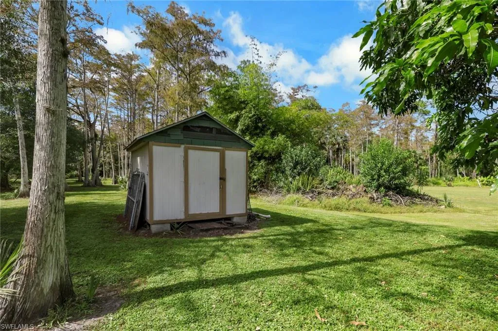 CLEARED 2.58 LOT – Beautifully manicured with mature trees, this partially fenced and irrigated lot offers privacy and convenient location closer to town. Behind double gates is a CBS block home with 2 car garage, vaulted ceilings, 3 bedrooms with split floorplan, en-suite master with attached bath and walk-in closet, 2nd guest bath, interior laundry room and tons of potential for updated finishes. Great bones, fireplace, ample natural light and a newer roof make this a great opportunity to remodel, update or keep as is. Enjoy the outdoors with a lower maintenance lot including a storage shed and covered entertaining space near the back. Ideally located a quick drive to Publix, Founders Square, popular shops and restaurants, and accessible via Immokolee or Golden Gate Parkway.
