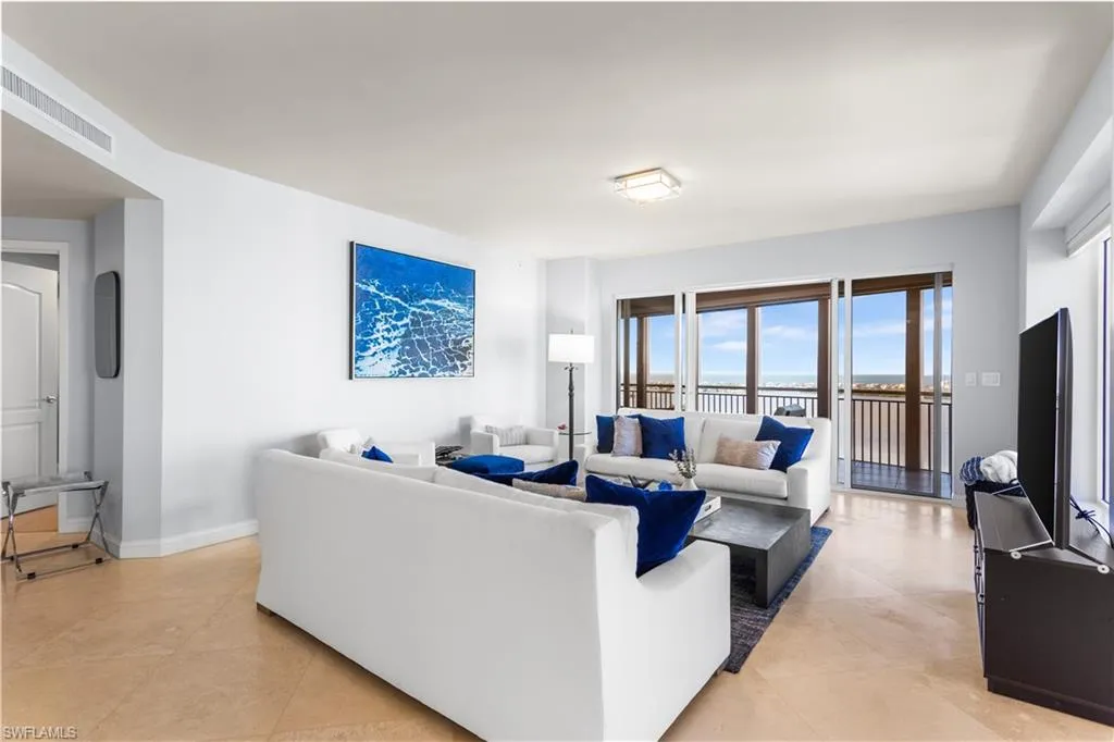 Welcome to this spacious 20th-floor end unit in Estancia at Bonita Bay, with UNPARALLED, breathtaking panoramic views of golf courses (eastern and western views), Estero Bay, and the Gulf of Mexico. Enjoy sunset views night after night – winter never felt so good! With three bedrooms plus a den/office and amazing resort style amenities, this stunning home combines refined elegance with everyday livability in one of Southwest Florida’s most sought-after communities. An abundance of natural light fills the open-concept living spaces, enhanced by floor-to-ceiling windows in every room capturing sweeping vistas from sunrise to sunset. The living area offers effortless flow to the expansive lanai, perfect for entertaining or relaxing while enjoying serene coastal views. The gourmet kitchen showcases Monogram stainless steel appliances, including an induction cooktop, oven, refrigerator, and microwave, complemented by granite countertops designed for both style and function. The primary suite is a private retreat featuring direct lanai access, two spacious walk-in closets, and electric shades. The primary bath includes dual sinks, a large jetted soaking tub, and a walk-in shower. Two guest bedrooms provide exceptional comfort, both with ensuite bathrooms, and plenty of closet space. The den offers a flexible space with astounding views. There are two dining areas – one is more formal and elegantly accented with a custom ceiling detail, while the other is just off the kitchen and perfect for everyday dining. The laundry room includes a utility sink for added convenience. Recent upgrades include new windows in all bedrooms, two AC units (2022), and a new hot water heater (2025), ensuring modern comfort and peace of mind. Residents of Estancia enjoy an amenity-rich lifestyle featuring a resort-style pool and spa, fitness center, guest suites, and club room, along with access to Bonita Bay’s unparalleled offerings—a private beach park, pickleball, tennis, kayaking and canoeing, miles of walking and biking paths, community parks, and a full-service marina and waterfront restaurant. Optional club memberships provide access to five championship golf courses, fine dining venues, and an expansive sports complex. Perfectly located near world-class shopping, dining, and beaches, and just a short drive to RSW International Airport, this exceptional home invites you to experience the very best of Southwest Florida luxury living—ideal as a seasonal retreat or year-round residence.